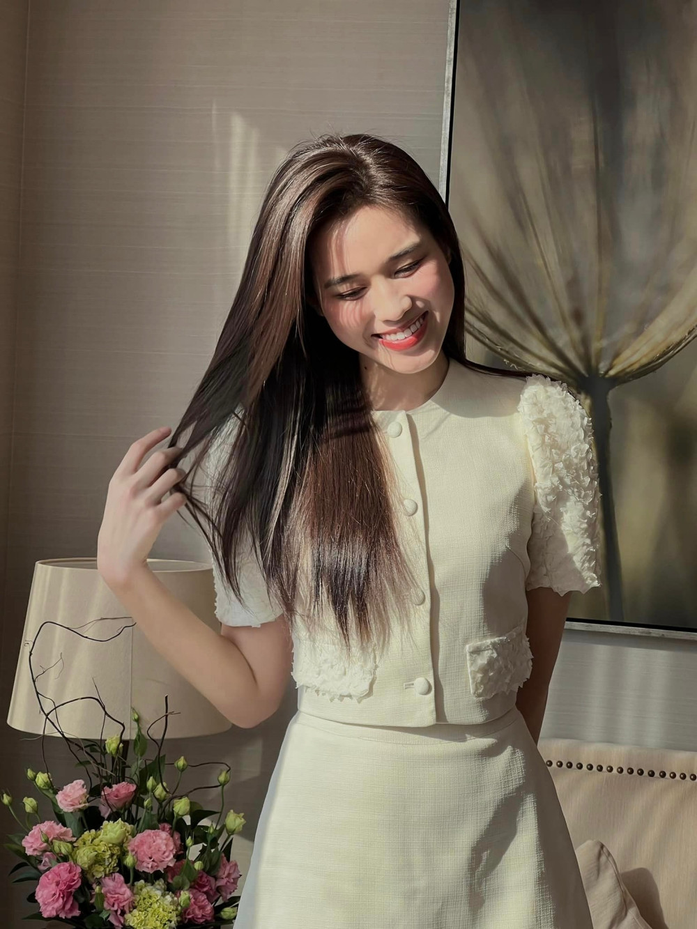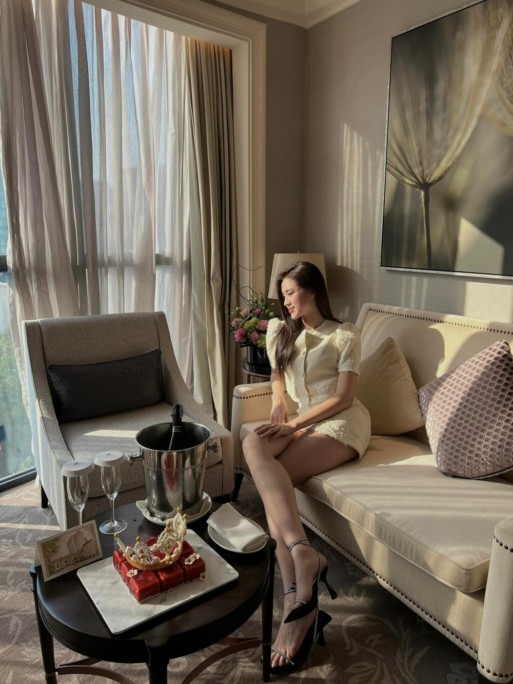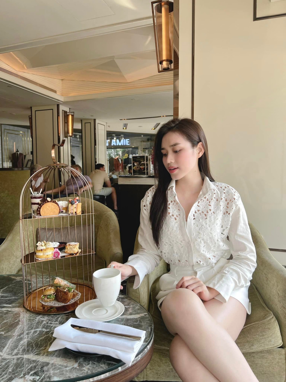 Nàng hậu tươi tắn trong buổi cà phê trà chiều, sáng bừng cả một góc phòng.