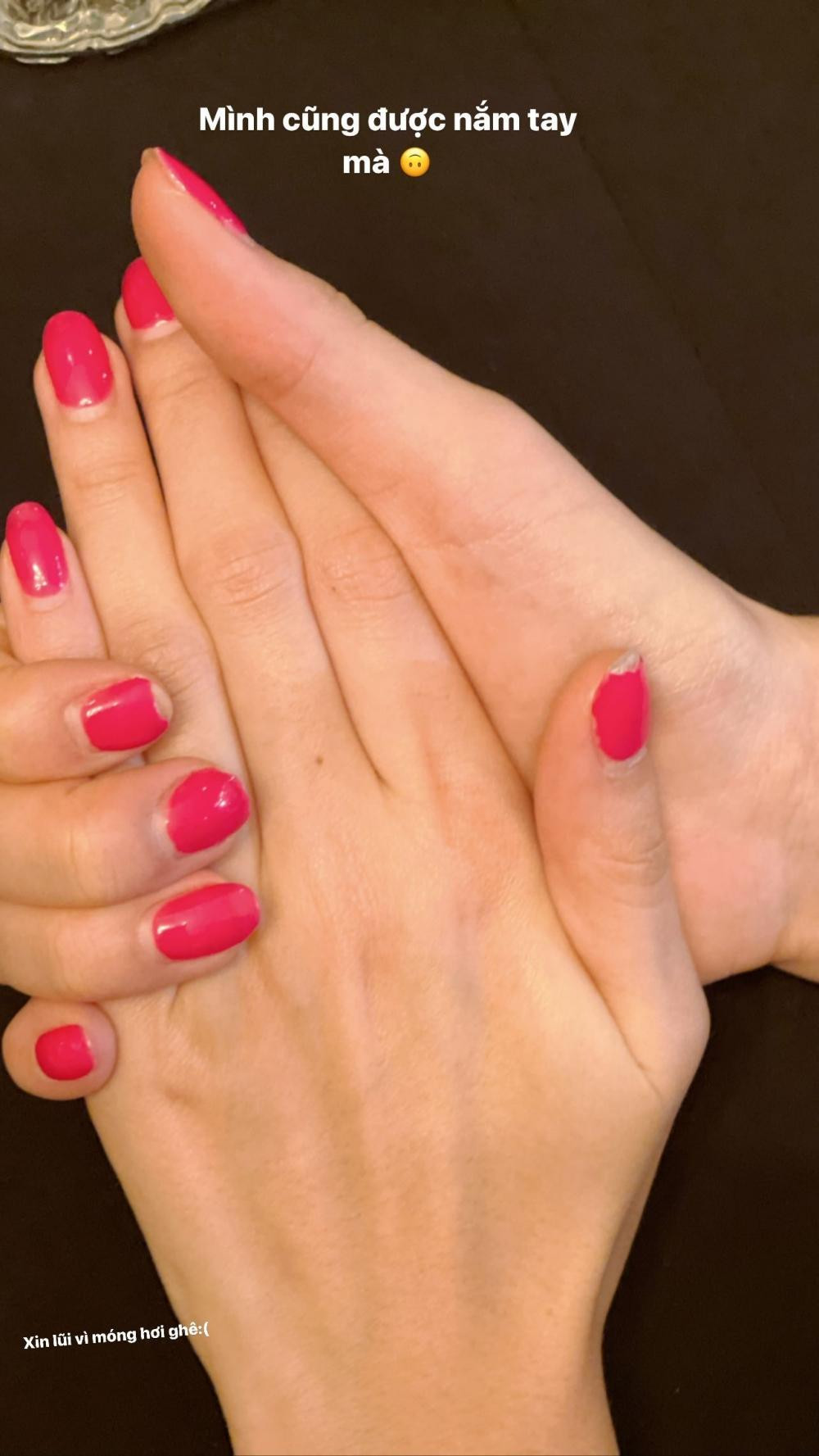 Tay của Hoa hậu Đỗ Thị Hà có sơn móng tay, còn tay trong bức ảnh trên không hề sơn móng tay. Người đẹp còn hài hước tự nắm tay mình và trêu đùa “Mình cũng được nắm tay chứ bộ, các bạn nói gì zợ” khiến người hâm mộ cười “té ghế”.