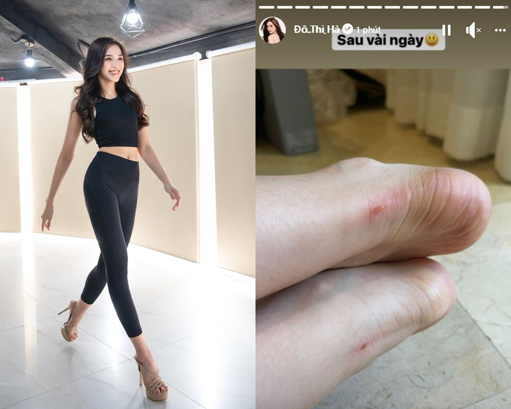 Trong thời kỳ tập luyện để chuẩn bị tham gia Miss World 2021, Đỗ Thị Hà liên tục phải tập catwalk trên những đôi giày cao gót chênh vênh. Chỉ sau vài ngày, gót chân nàng hậu đã phồng rộp do cọ xát vào quai dép sandal, khiến cô luôn bị đau đớn khi di chuyển.