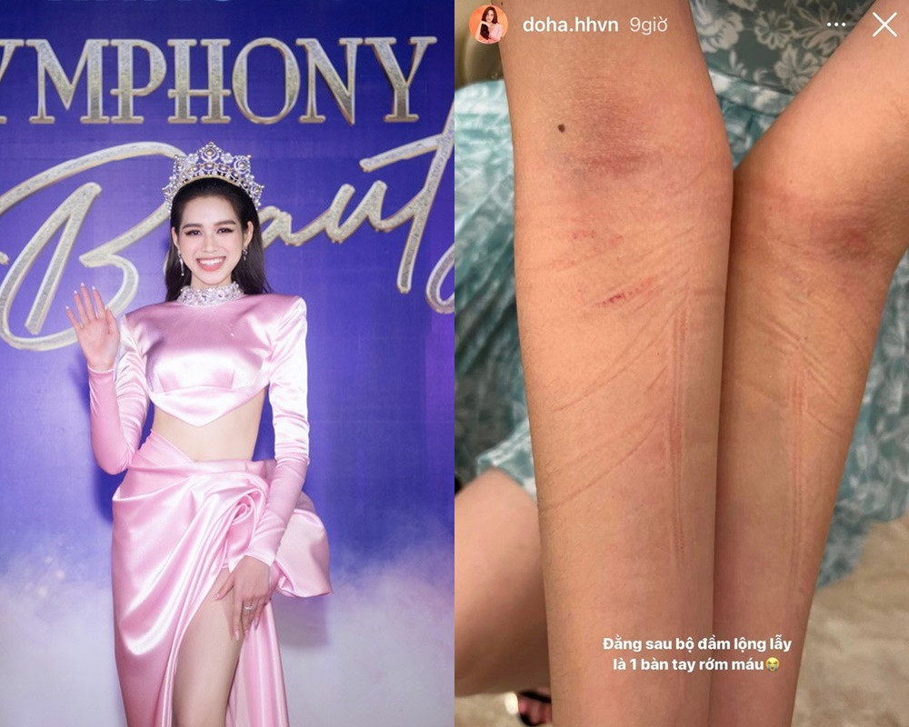 Nhưng mới đây, Đỗ Thị Hà đã chia sẻ loạt ảnh cô bị trầy xước, rớm máu khắp cơ thể do mặc thử đồ trình diễn trong đêm thi Trang phục Dân tộc của Miss Grand Vietnam 2023. Có thể thấy bộ váy đính kết rất nhiều kim sa, hạt đá và chúng đã cọ xát khiến cho làn da nàng hậu không tránh được thương tổn.