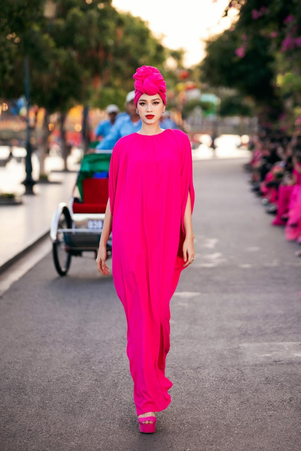 Cô diện thiết kế oversize tông hồng cánh sen, với điểm nhấn đắt giá là phụ kiện khăn tóc.