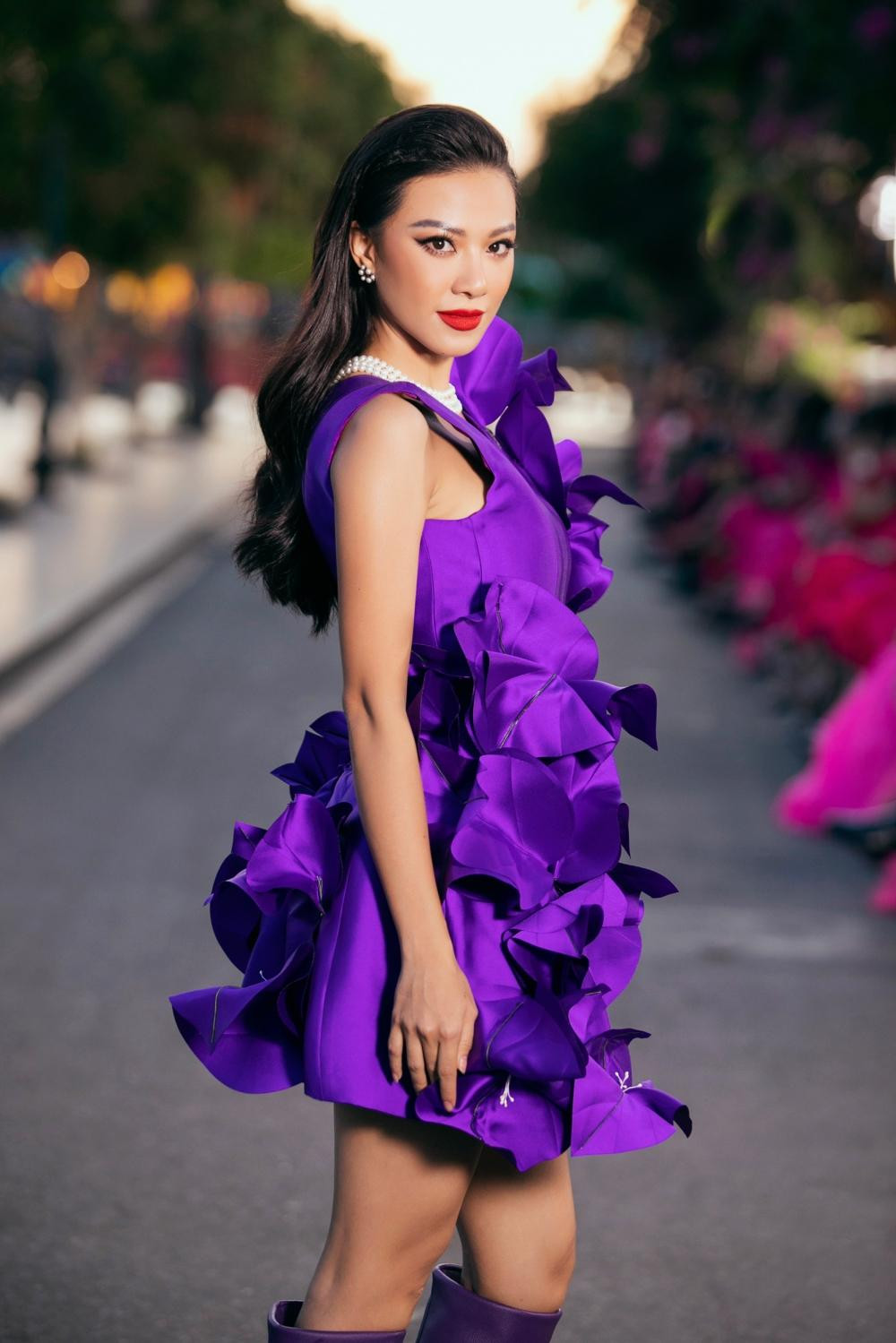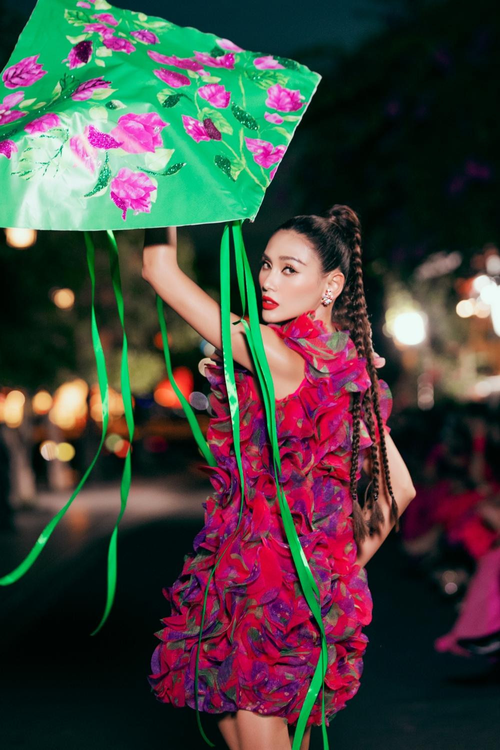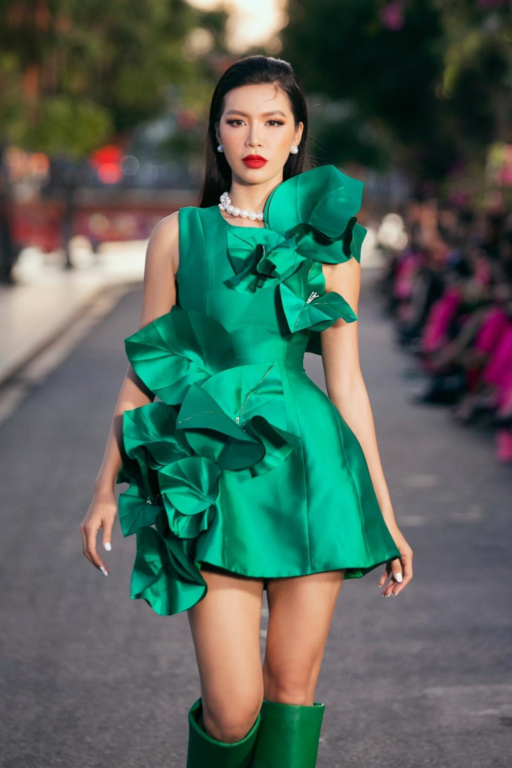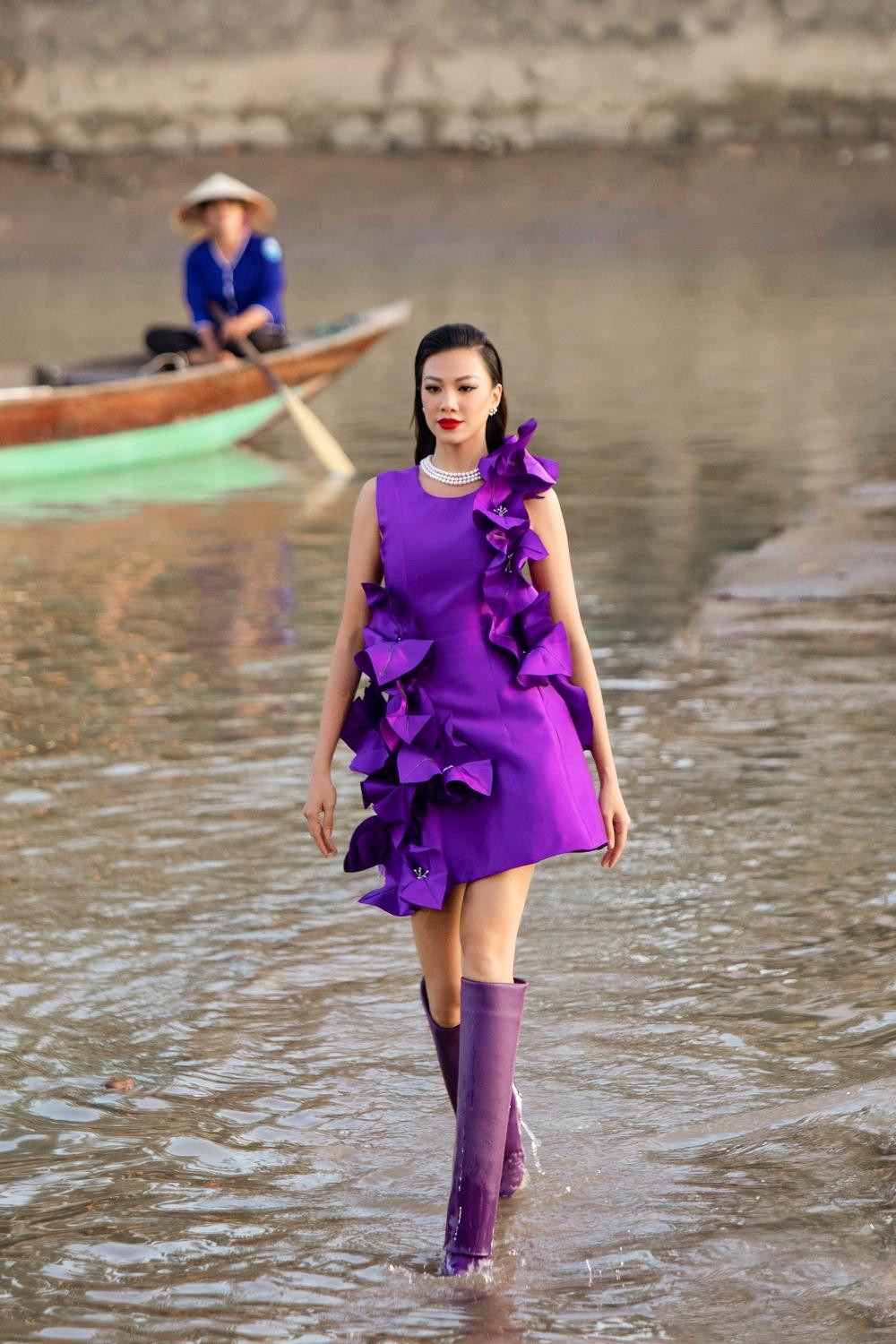 Siêu mẫu Minh Tú và Á hậu Kim Duyên xuất hiện từ phía bờ bên kia của dòng sông, catwalk điêu luyện trên sàn runway nổi.