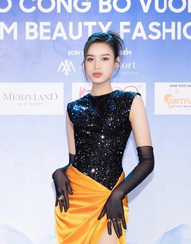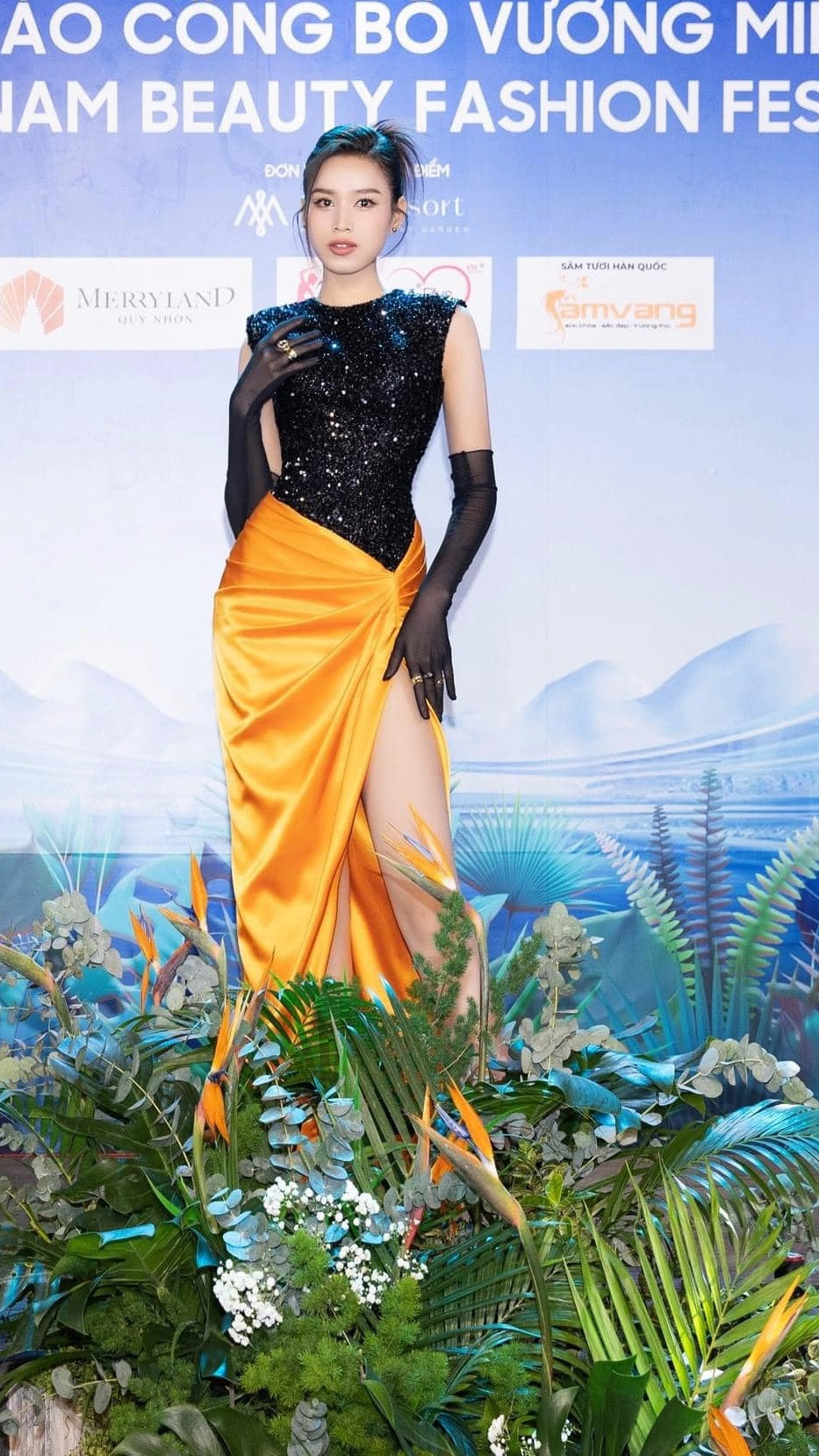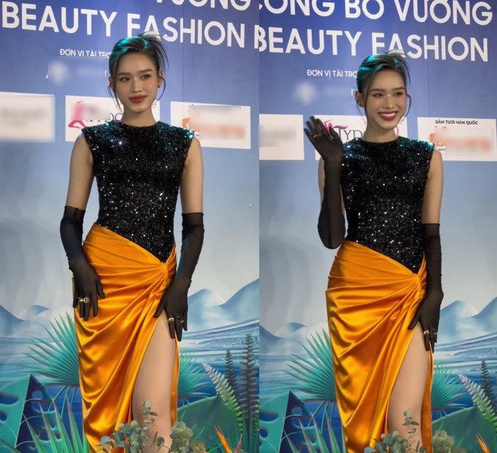 Bộ váy kết hợp hai màu đen và vàng vô cùng nổi bật, đôi găng tay đồng điệu mang lại vẻ đẹp cổ điển cho nàng hậu trong khi đường xẻ cao ở chân váy tiếp tục giúp Đỗ Thị Hà khoe được đôi chân đẹp cực phẩm.