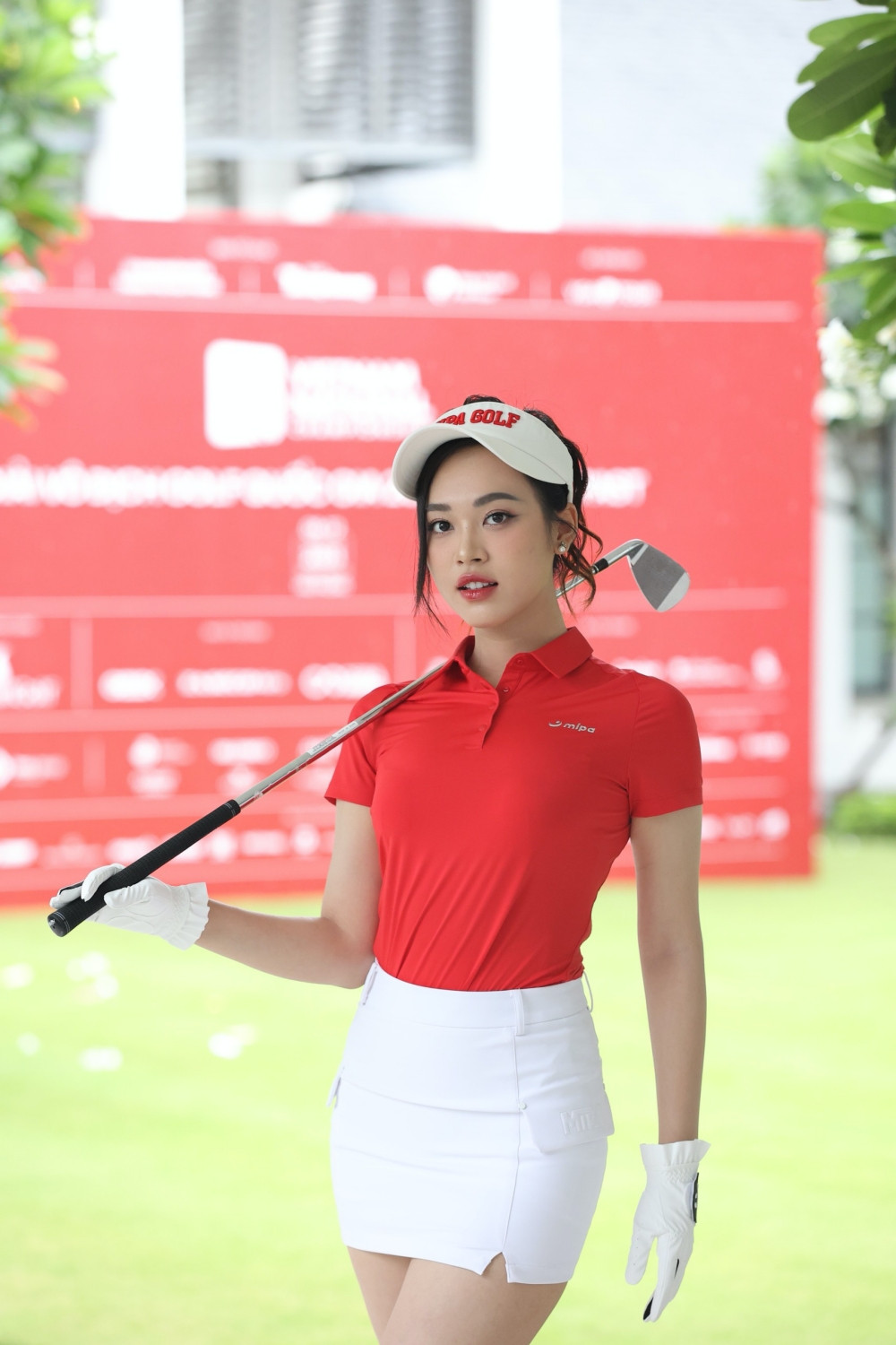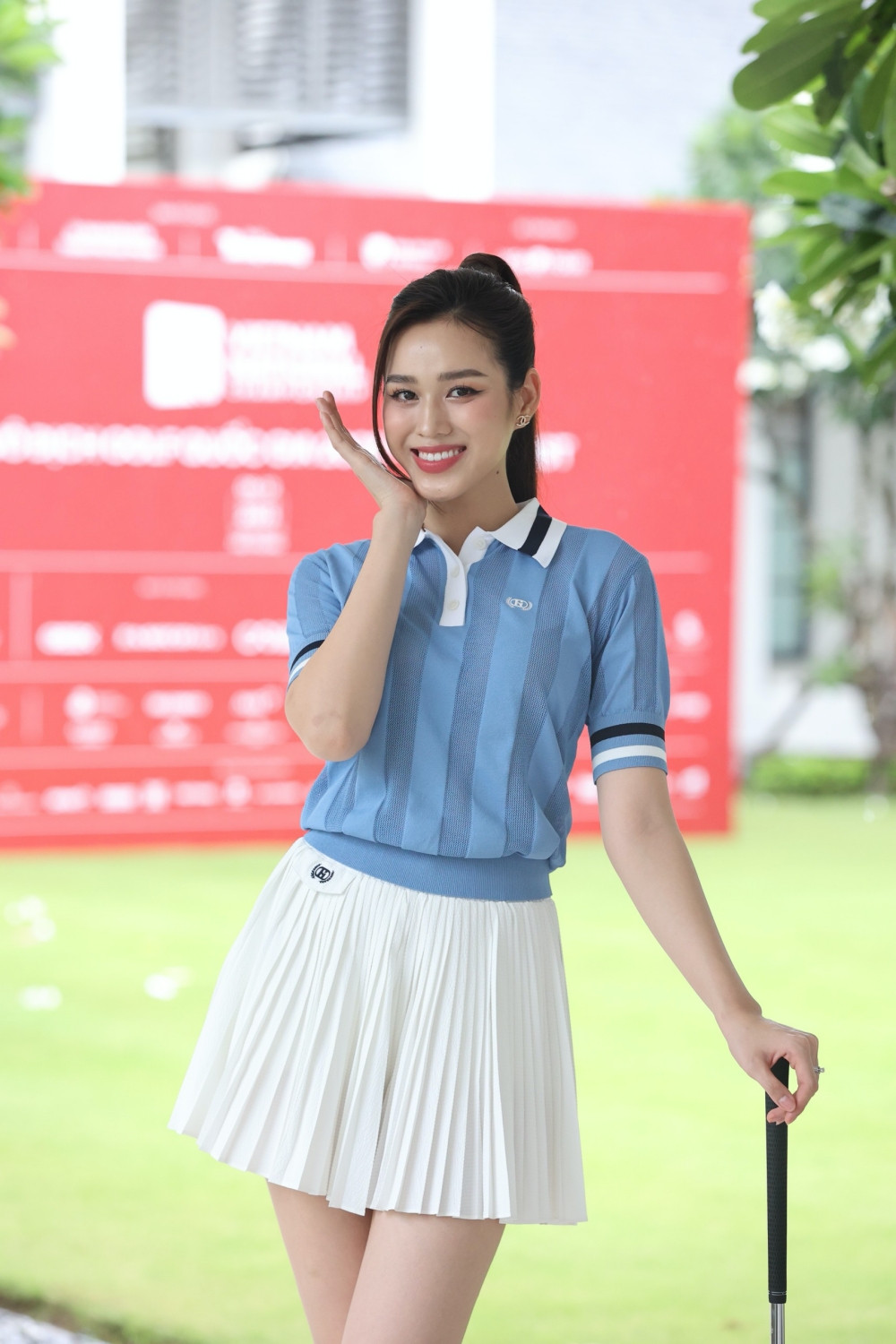 Hoa hậu Đỗ Thị Hà đã nhiều năm đồng hành cùng các sự kiện golf do báo Tiền Phong phối hợp tổ chức. Nàng hậu diện trang phục đơn giản, màu sắc dịu nhẹ, khoe đôi chân dài thương hiệu 1m11 tại sự kiện.