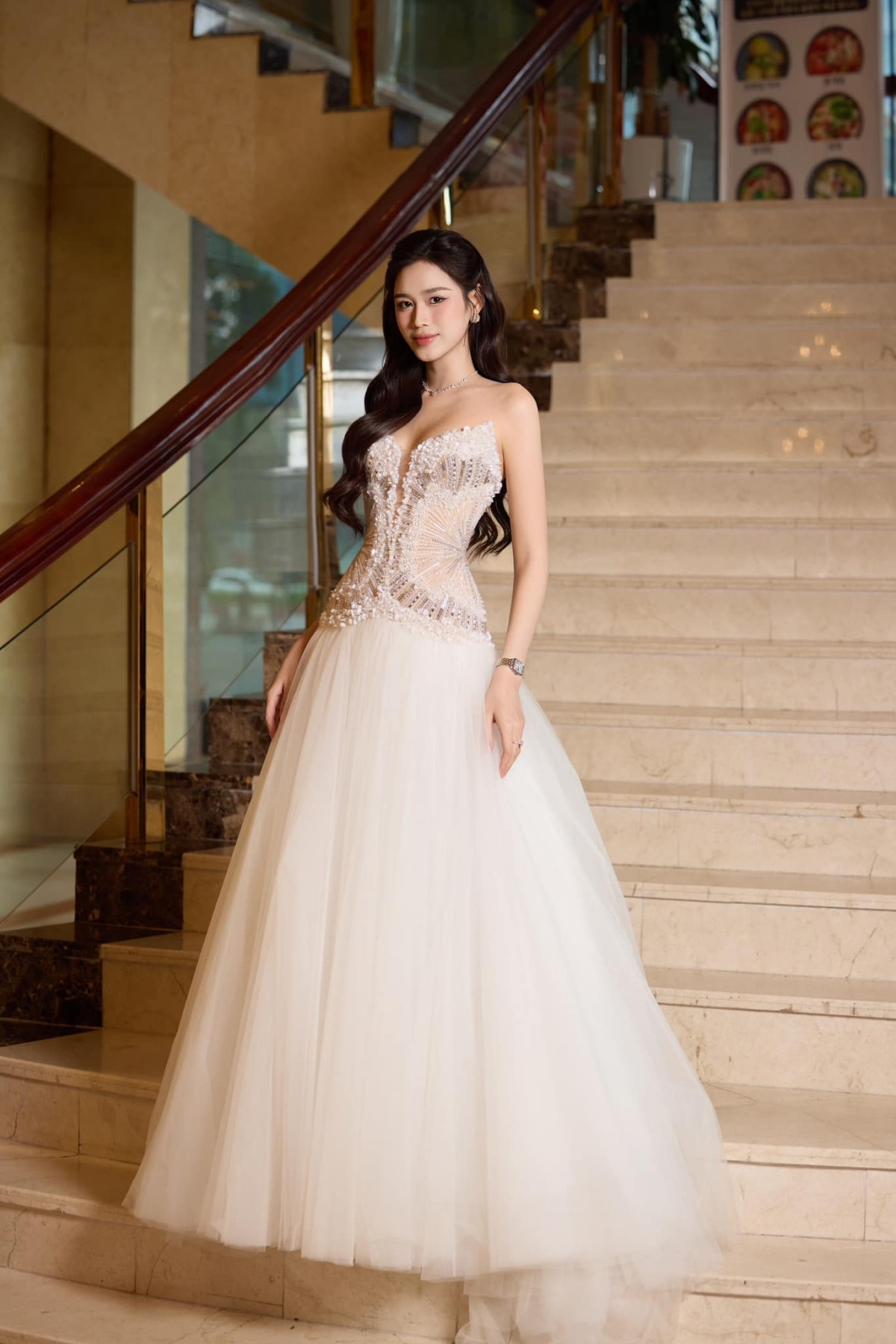 Chiếc váy là tác phẩm của NTK Lê Thanh Hòa, có phần thân trên thiết kế theo form áo corset, lấy cảm hứng từ hình ảnh lá sen thanh khiết, được đính kết từ hàng nghìn hạt pha lê và sequin. Phần chân váy được tạo hình từ nhiều lớp tulle cao cấp, mang đến sự mềm mại, nhẹ nhàng, giúp người đẹp như một nàng công chúa bước ra từ truyện cổ tích.