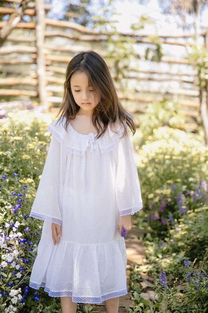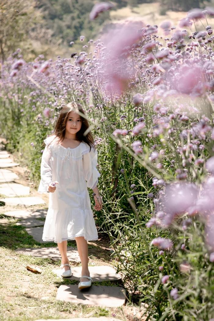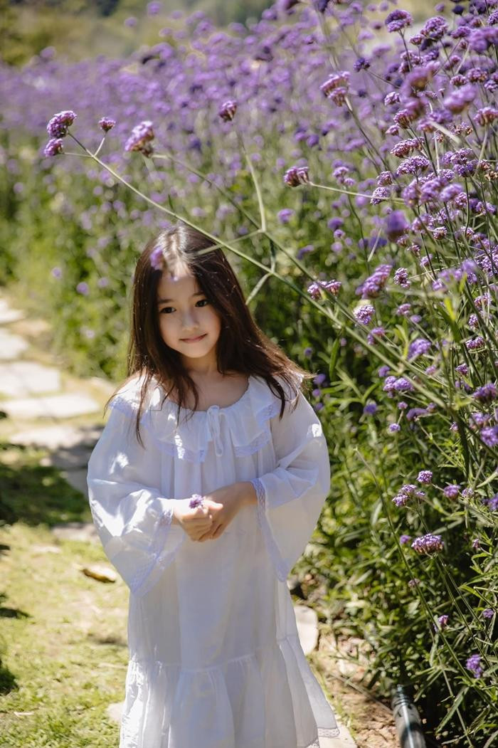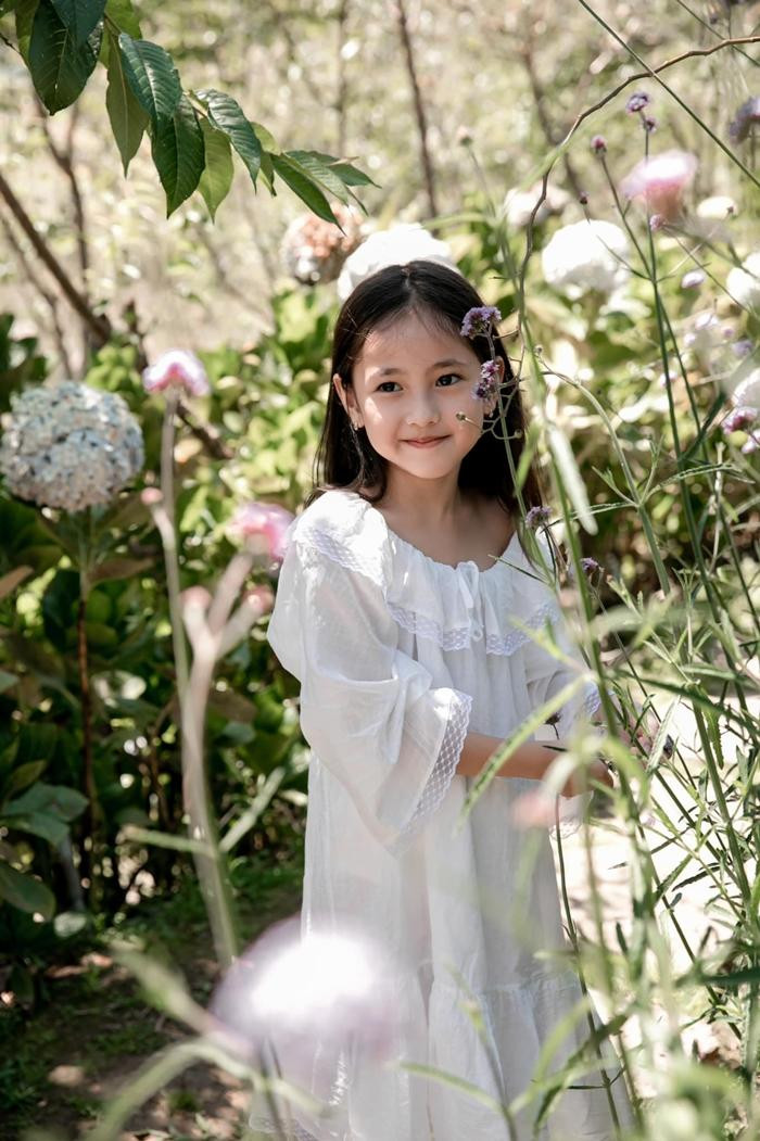 Mặc váy trắng tinh khôi, tóc xõa mềm mượt, tạo dáng bên cạnh những khóm hoa, Viann được cư dân mạng so sánh với hàng loạt các danh xưng đáng yêu như “tiểu mỹ nhân, công chúa nhỏ, nàng tiên hoa nhí”.