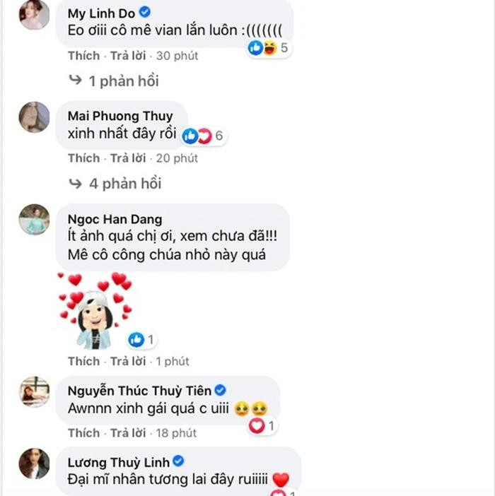 Dàn Hoa - Á hậu đình đám của showbiz Việt cũng thi nhau vào thả tim và dành những lời khen có cánh cho cô bé. Sau gần một ngày, loạt hình ảnh của Viann đã nhận được lượt like và comment kỷ lục trên trang cá nhân của mẹ, gấp 3-4 lần so với các post khác của Hoa hậu Hà Kiều Anh.