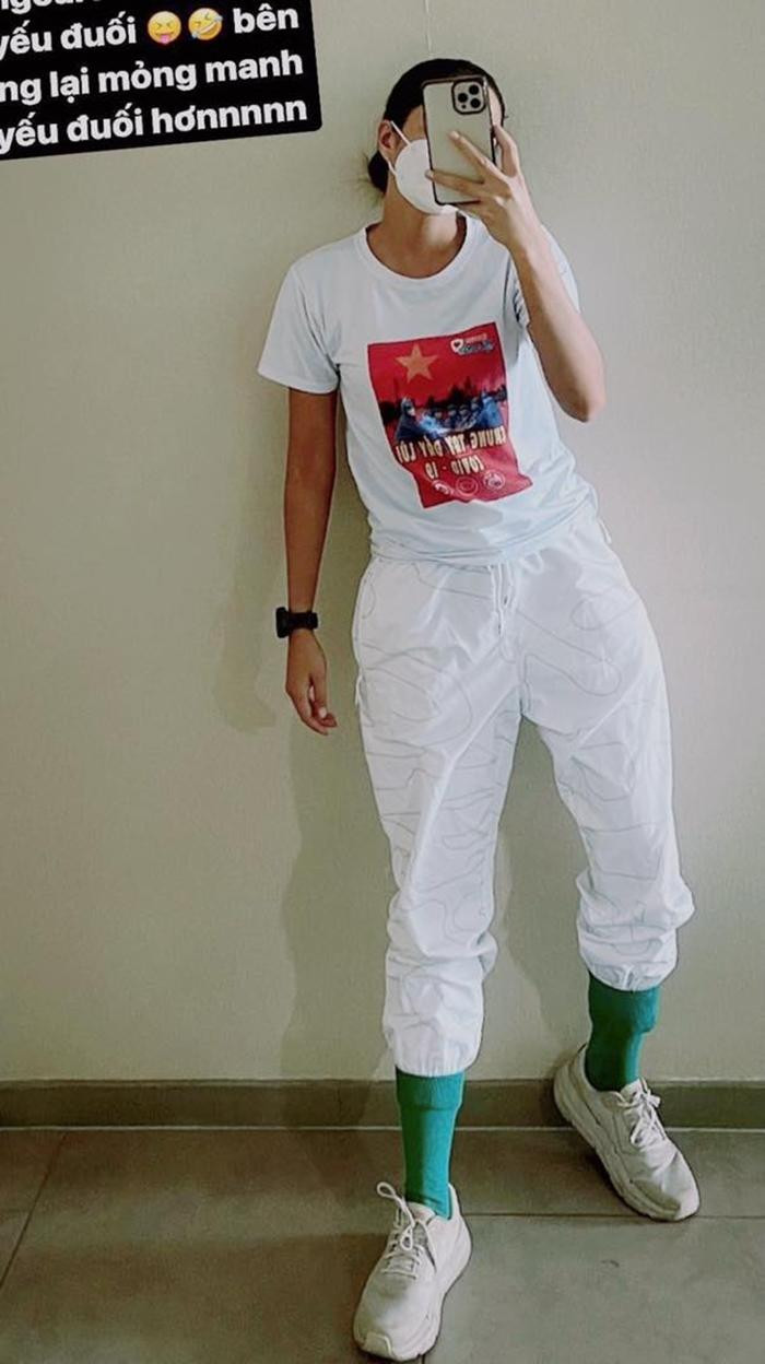 Ngày 13/7, Hoa hậu H’Hen Niê cũng tới chung cư Nhiêu Lộc ở Tân Phú để hỗ trợ lấy mẫu chống dịch, tranh thủ những lúc nghỉ ngơi, nàng hậu có bức ảnh chụp trang phục mặc đi chống dịch nhận được rất nhiều lời khen của người hâm mộ.