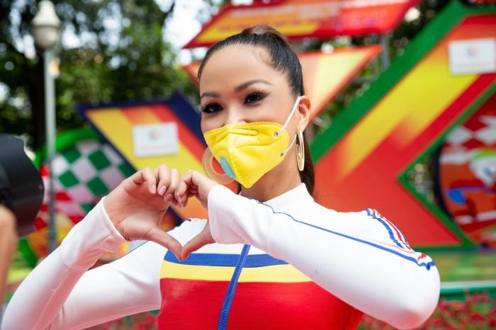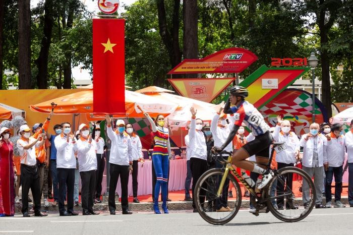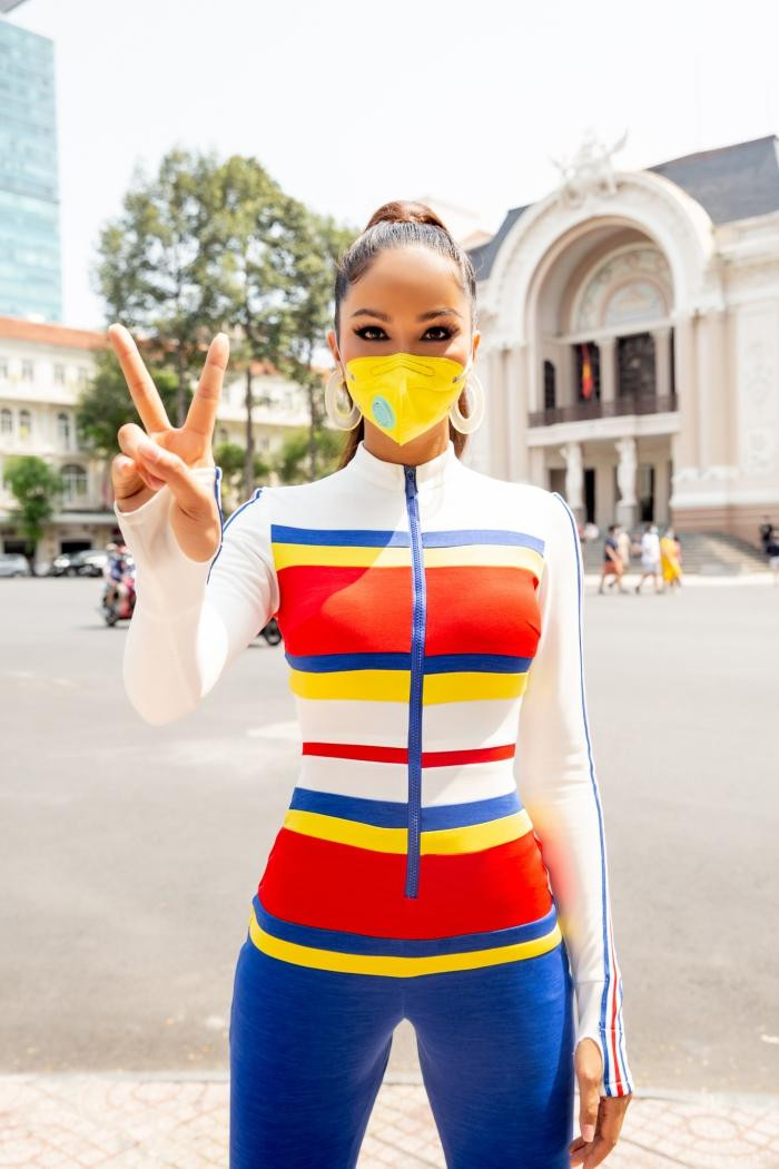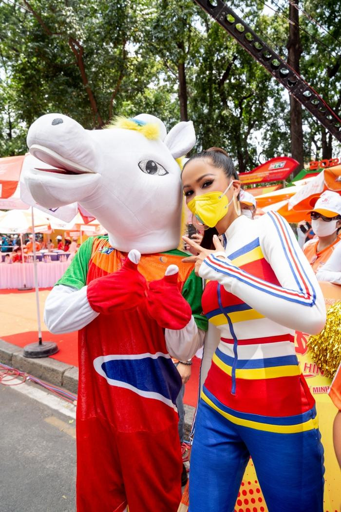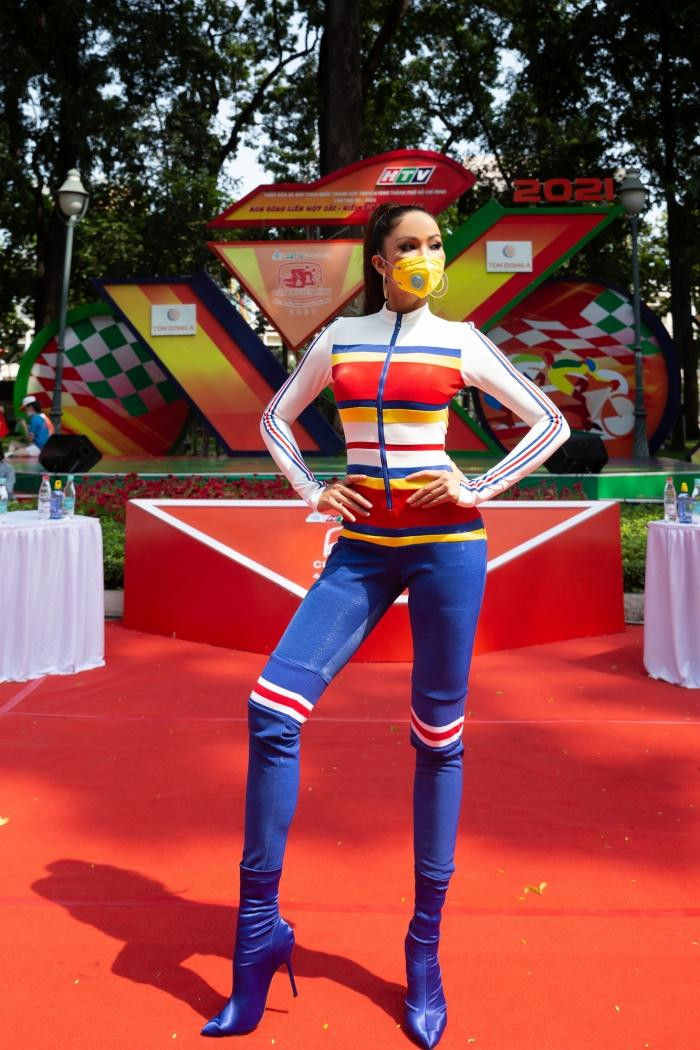 HHTO - Sáng 30/4, Hoa hậu H’Hen Niê đeo khẩu trang, diện đồ thể thao sắc màu kiểu jumpsuit ôm sát để cổ vũ các tay đua hoàn thành xong chặng cuối của cuộc đua xe đạp Cúp truyền hình TP.HCM 2021.