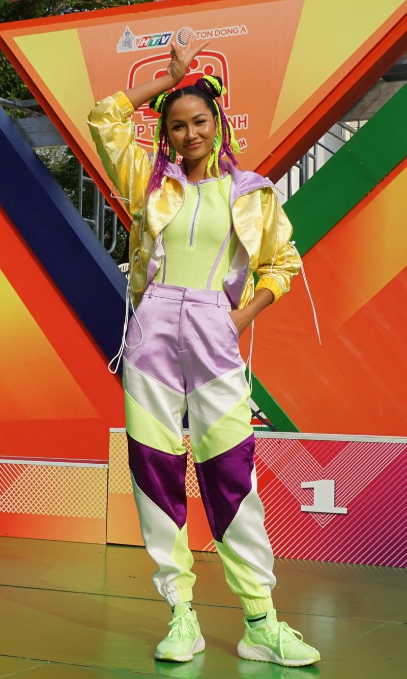 Với kiểu tóc tết hai búi có dây tóc màu, H’Hen Niê được chuyên viên trang điểm “ruột” hướng dẫn từ trước cách đan dây màu sao cho đúng. Màu nổi vẫn là ưu tiên hàng đầu của người đẹp, với điểm nhấn là đôi giày màu xanh neon rực rỡ.
