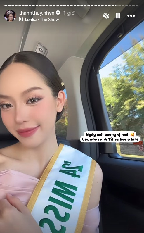 Một ngày sau đăng quang, Thanh Thủy có bài đăng đầu tiên trên trang cá nhân. Đương kim Miss International đăng ảnh ngồi trên xe di chuyển đến nơi làm việc. Cô để kiểu tóc búi, trang điểm ngọt ngào giống layout đêm chung kết.