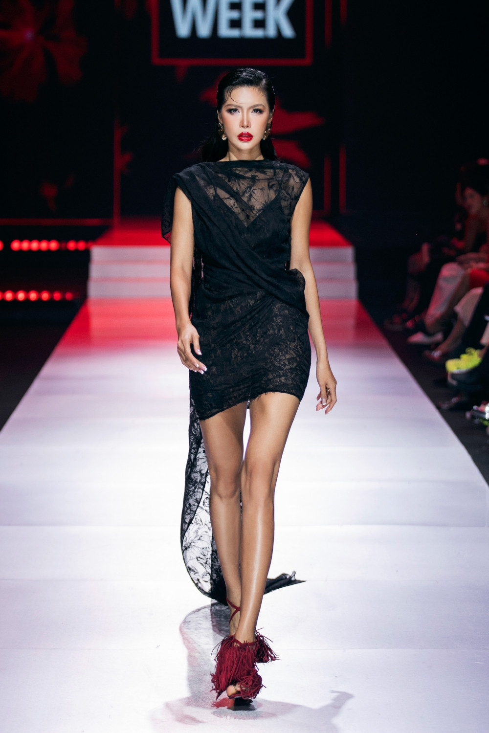 Siêu mẫu Minh Tú xuất hiện trong bộ váy ngắn bằng tơ lụa đen được thêu hoa tỉ mỉ với phần tà phá cách được thả qua vai, bay bổng theo từng sải bước.