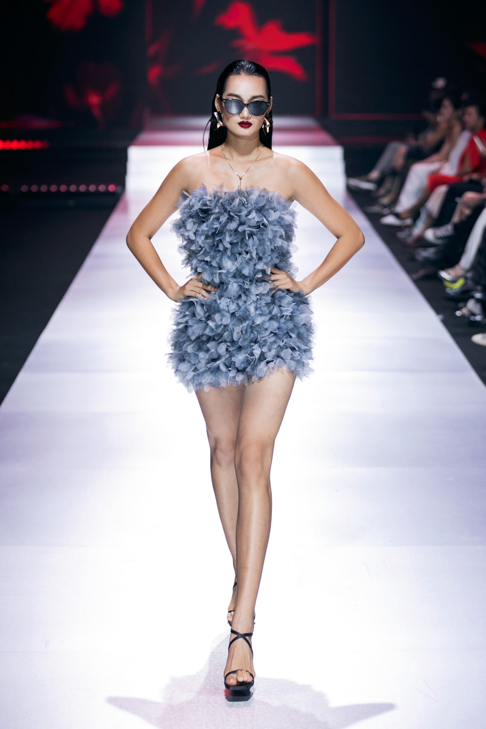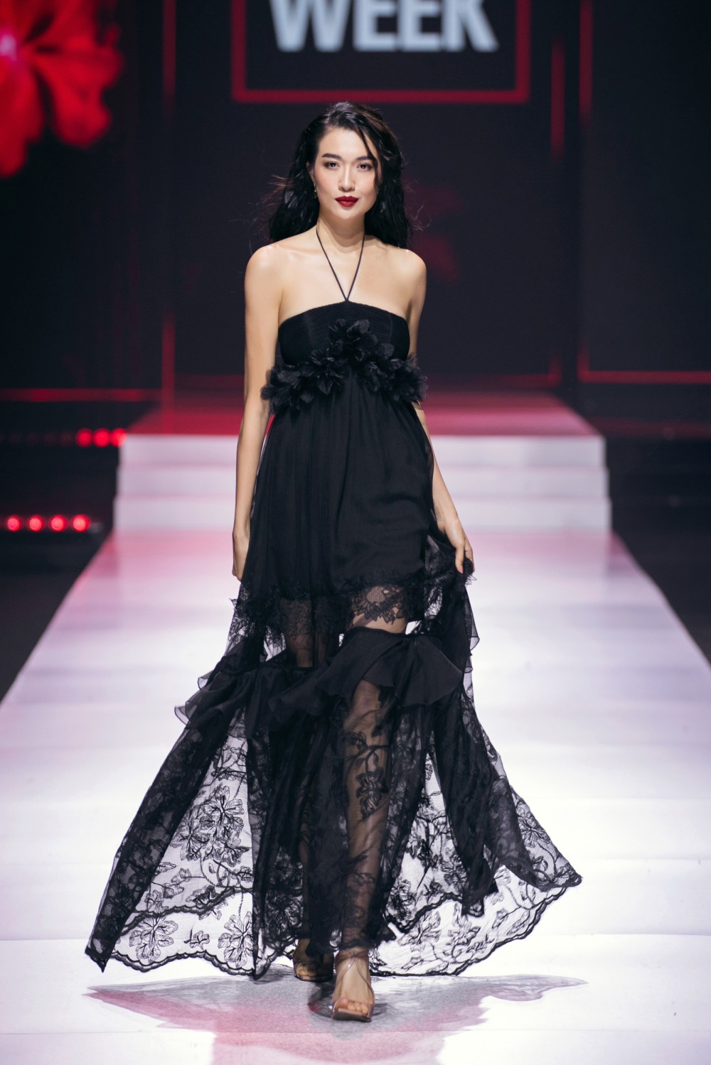 Hoa hậu H’Hen Niê xuất hiện với vai trò vedette, làm chủ sân khấu trong thiết kế cổ yếm, váy được dập phồng tỉ mỉ và phần tà lả lướt như cánh bướm đêm.