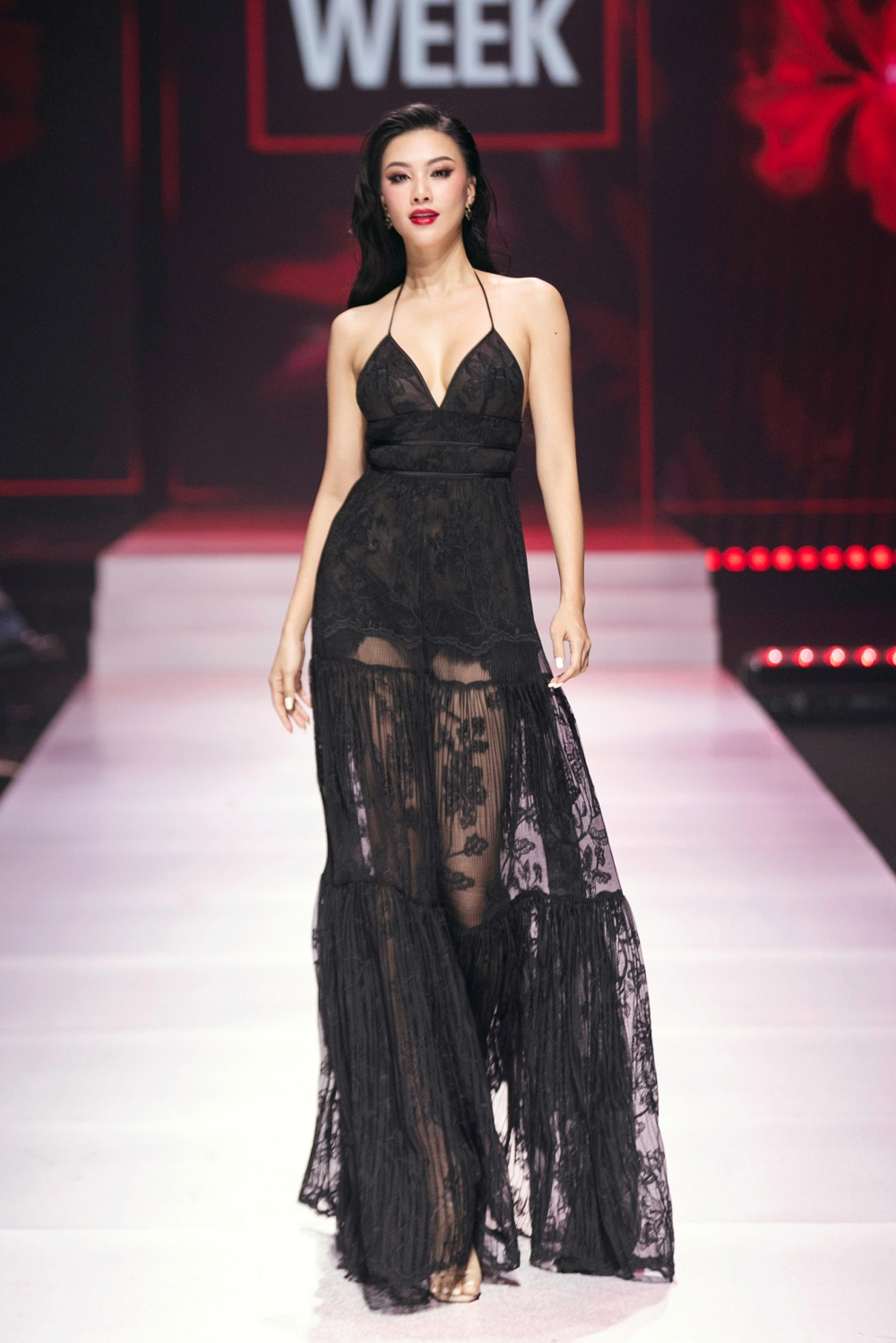 Sải bước mở màn của cặp đôi Á hậu Lệ Hằng - Kim Duyên thu hút mọi ánh nhìn. Á hậu Lệ Hằng diện thiết kế với chất liệu tơ bay bổng, xuyên thấu, phối hợp cùng chi tiết kết đính hoa được làm từ tơ lụa mềm mại. Á hậu Kim Duyên quyến rũ trong bộ váy hai dây xuyên thấu bằng tơ lụa đen, điểm xuyến chi tiết hoa thời thượng.