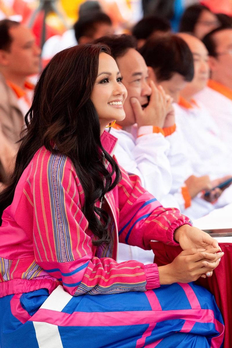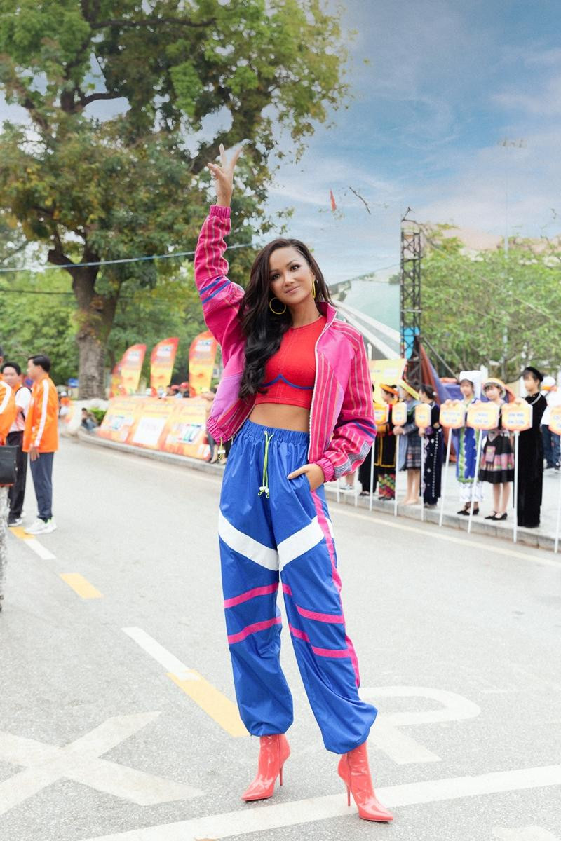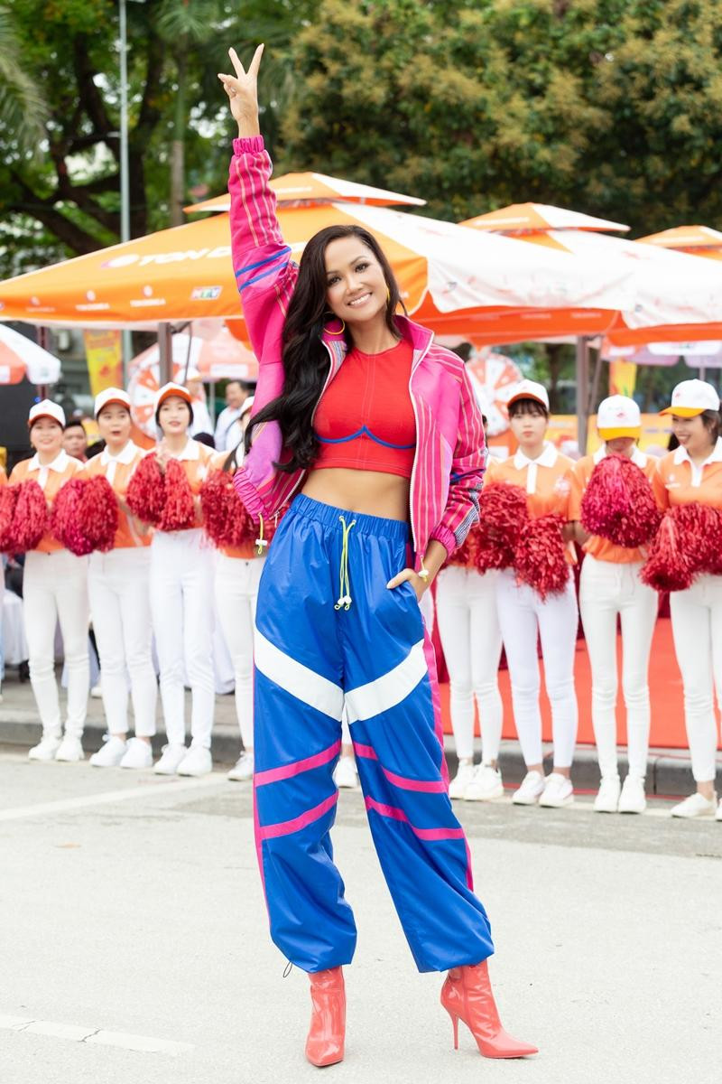 Tại chặng khởi động năm nay, H’Hen Niê chọn chiếc áo khoác bằng chất liệu vải thổ cẩm Ê đê, phối cùng crop-top và quần thể thao. Người đẹp khoe khéo vòng eo 59 cm mà cô đã vất vả tập luyện trong suốt một tháng qua.