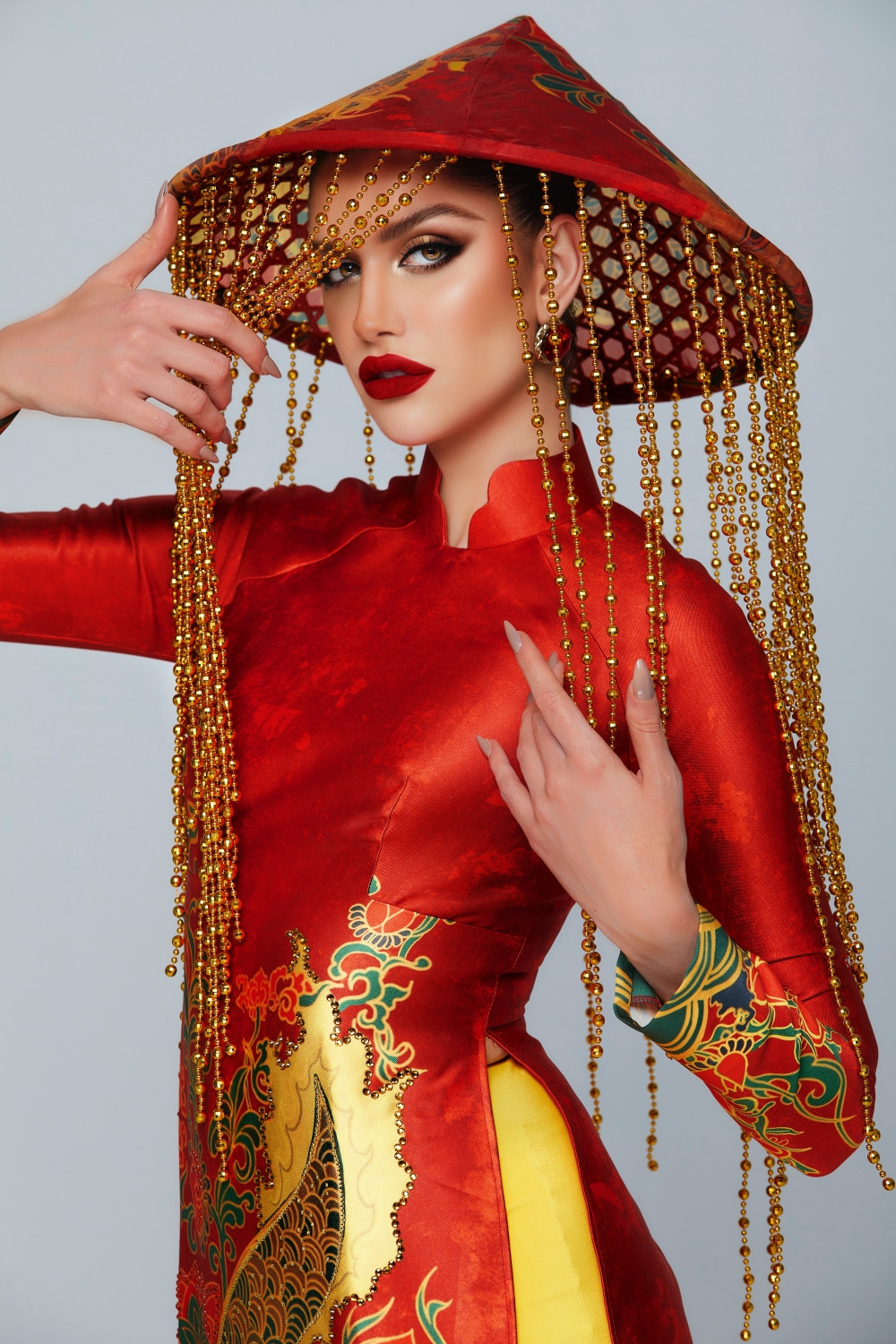 Trong bộ ảnh mới nhất, Hoa hậu Isabella Menin diện thiết kế áo dài truyền thống đến từ NTK La Sen Vũ. Không chỉ diện áo dài cùng chiếc vương miện ngọc lục bảo, Isabella còn kết hợp áo dài và nón lá với màu sắc đồng điệu.