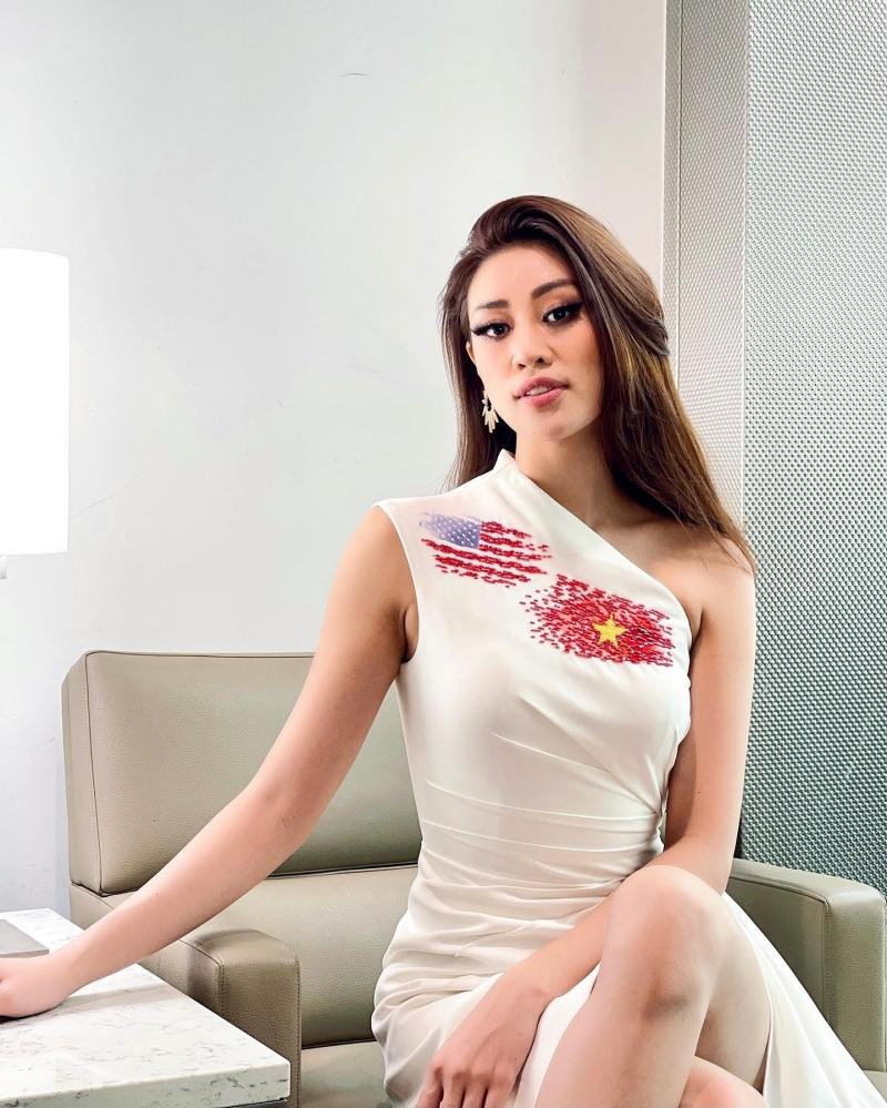 Cập nhật những hình ảnh đầu tiên của mình trên đất Mỹ, Hoa hậu Khánh Vân đã có sự giới thiệu trang phục mình mặc hoàn toàn bằng tiếng Anh, tạm lược dịch như sau: “Xin chào Houston, Mỹ. Lần đầu tới Mỹ thật sự vô cùng phấn khích. Ngày đầu tiên, tôi chọn mặc chiếc váy này với hình lá cờ Việt Nam in ở phía trước ngực, và cờ Mỹ in ở phía bên cạnh gần vai. Điều này thể hiện cho tình hữu nghị giữa hai nước Việt - Mỹ, và Việt Nam luôn nằm trong tim tôi…”