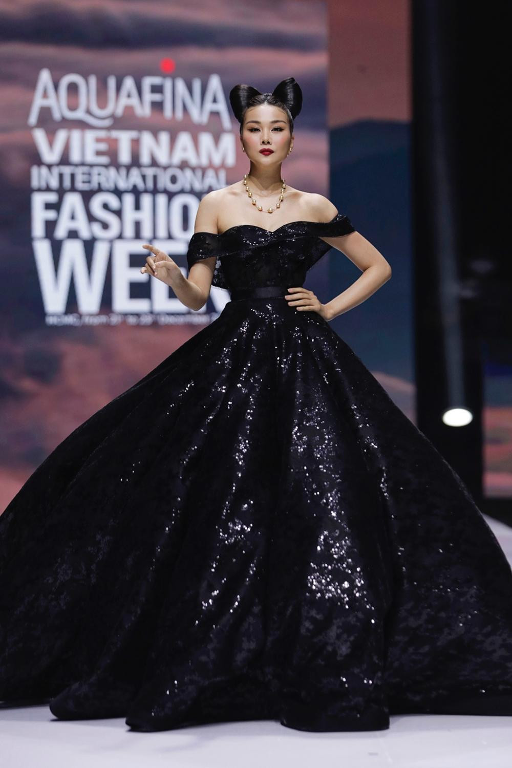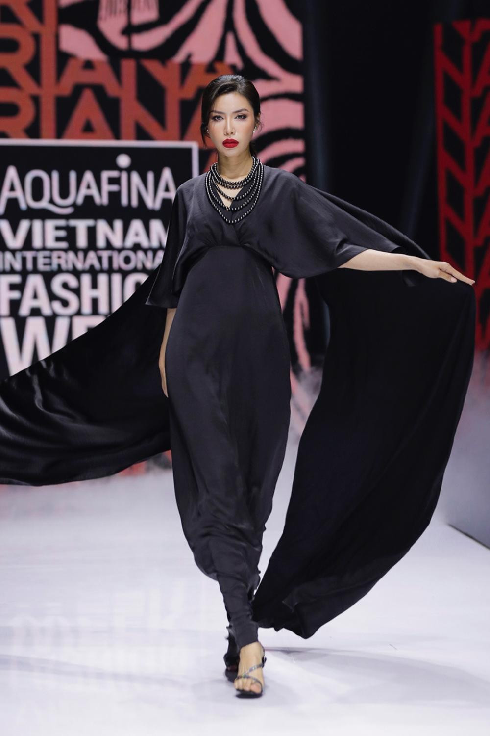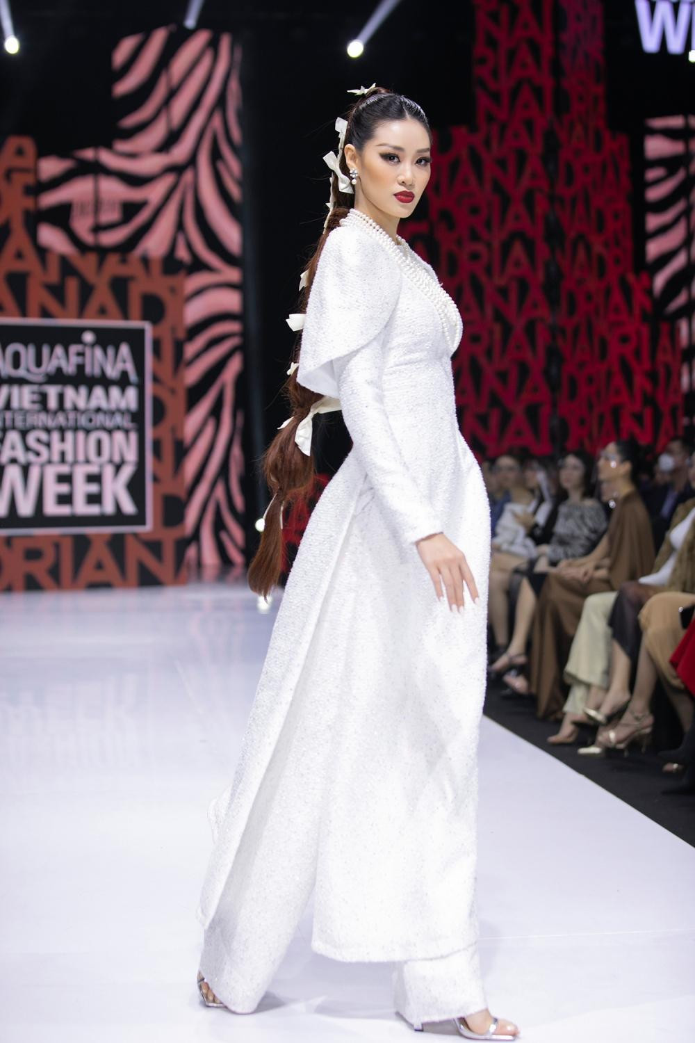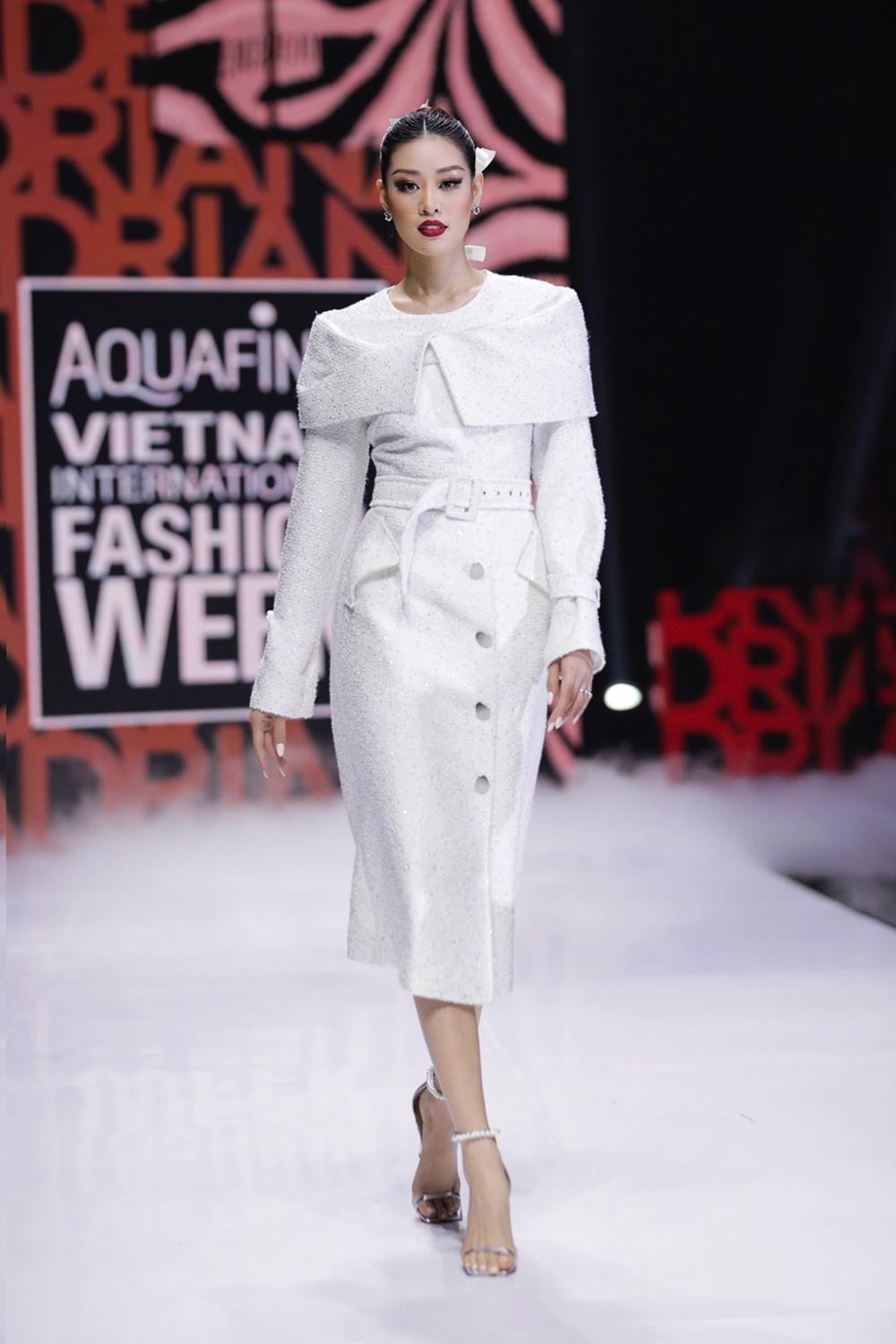 Hoa hậu Khánh Vân có màn xuất hiện ấn tượng trong show diễn này. Nàng hậu catwalk tự tin, thần thái đỉnh cao dù vừa phải giải quyết hàng loạt tin đồn thất thiệt ảnh hưởng không nhỏ đến hình ảnh của cô.