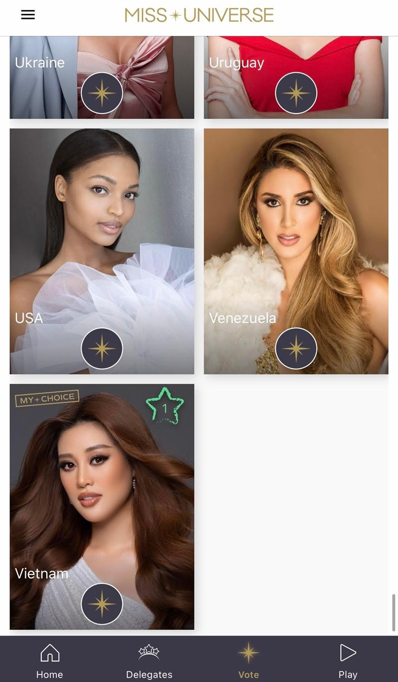 Khán giả yêu quý hoa hậu Khánh Vân có thể góp phần giúp cô có cơ hội vào Top 21 bằng cách tải app Miss Universe và bình chọn cho Nguyễn Trần Khánh Vân - Hoa hậu Hoàn vũ Việt Nam. Kết quả sẽ được công bố tại đêm Chung kết ngày 16/5 (giờ Mỹ). Hiện Khánh Vân đang tích cực hoàn thiện những công tác chuẩn bị cuối cùng cho hành trình đến với Miss Universe 2020.