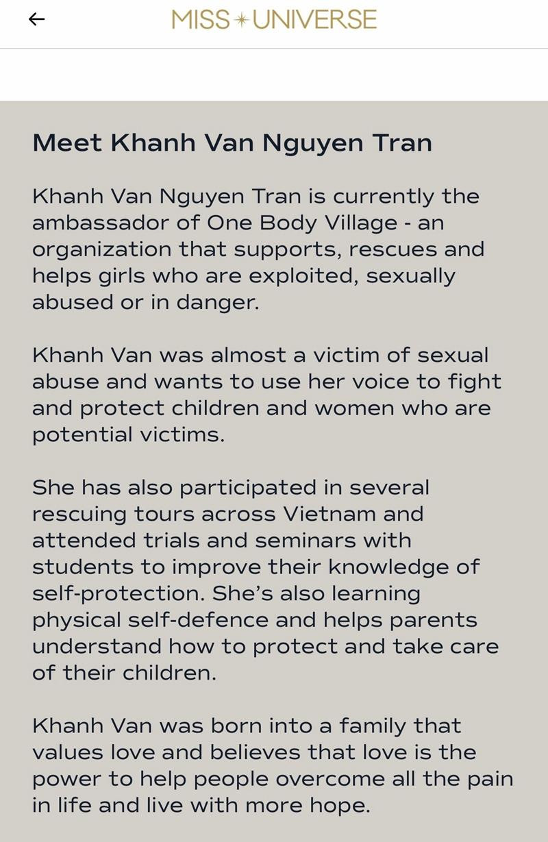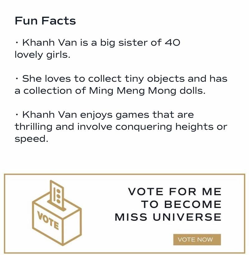 Ngoài ra, Miss Universe còn tiết lộ thêm về những điều thú vị xoay quanh Khánh Vân: Là "chị đại" của 40 em gái; Thích sưu tầm những đồ vật nhỏ và có một bộ sưu tập búp bê Ming Meng Mong; Thích những trò mạo hiểm cảm giác mạnh.