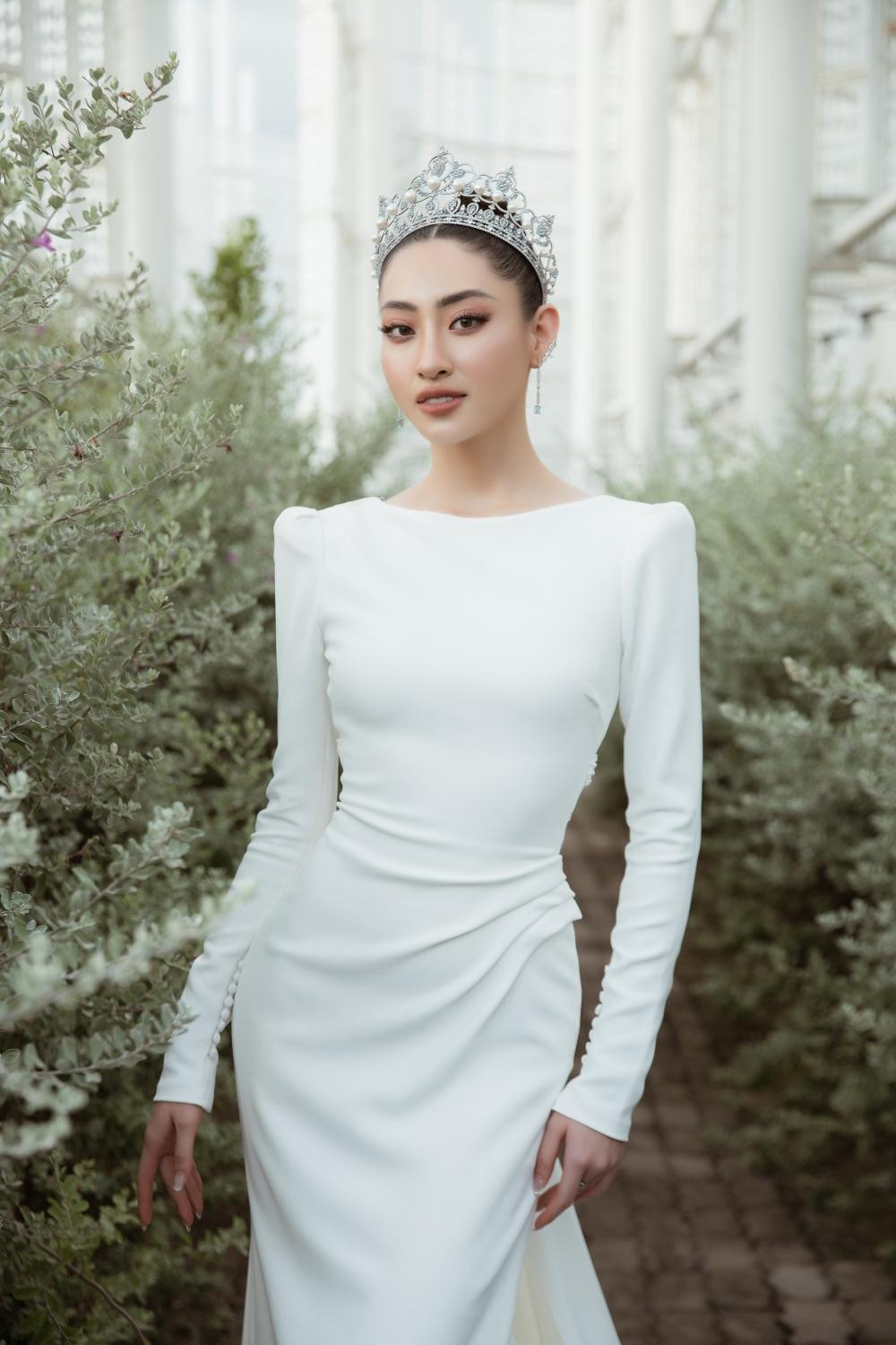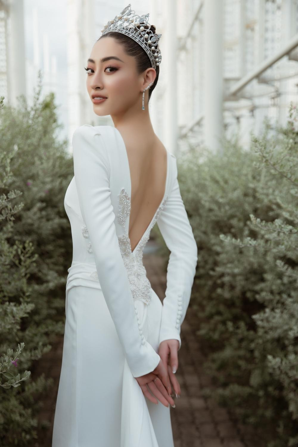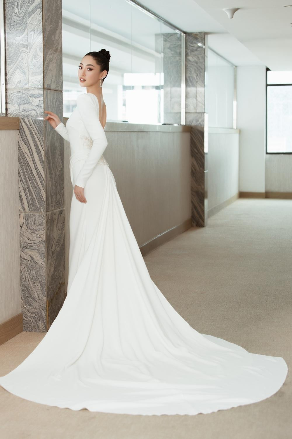 Diện trang phục cưới mang tông trắng, Hoa hậu Lương Thùy Linh khoe nhan sắc xinh đẹp yêu kiều và sang trọng. Thiết kế ôm eo với đuôi váy kéo dài, điểm nhấn ở phần khoét lưng sâu, có thêm những chi tiết đính kết sequin bắt sáng tự nhiên, được thực hiện cực kỳ tỉ mỉ.