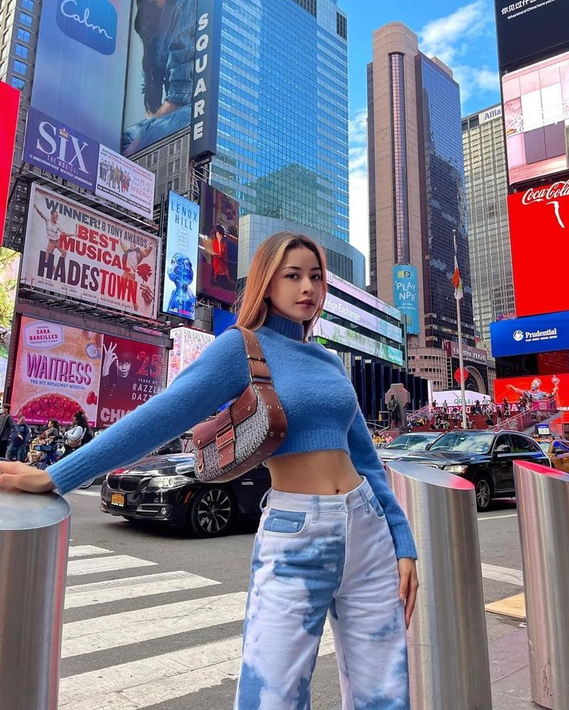 Chi Pu tung tăng trên đất Mỹ, khoe vòng 2 phẳng lì với áo len croptop phối cùng quần jeans loang màu độc đáo.