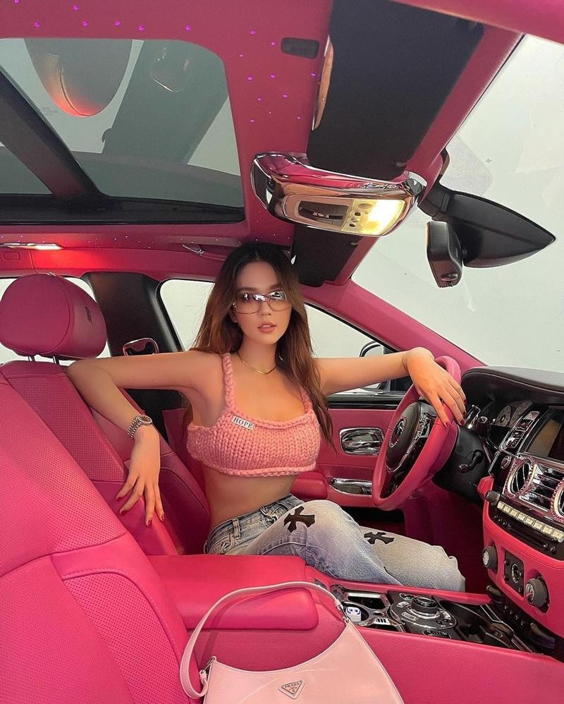Ngọc Trinh mặc áo crop-top len móc màu hồng pastel, mix cùng quần jeans Chrome Hearts có giá tham khảo hơn 140 triệu đồng.