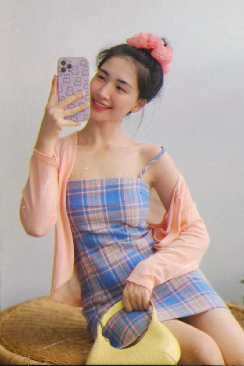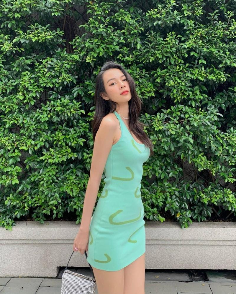 Phí Phương Anh tự tin khoe vóc dáng thon gọn khi mặc váy body cổ yếm màu xanh mát mắt.
