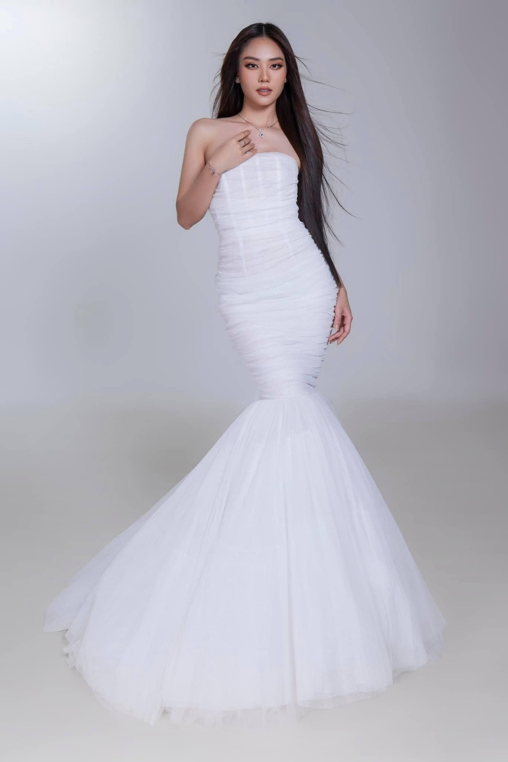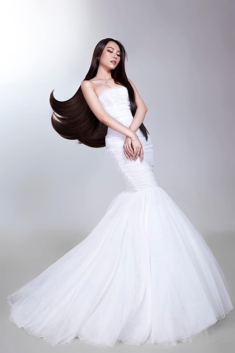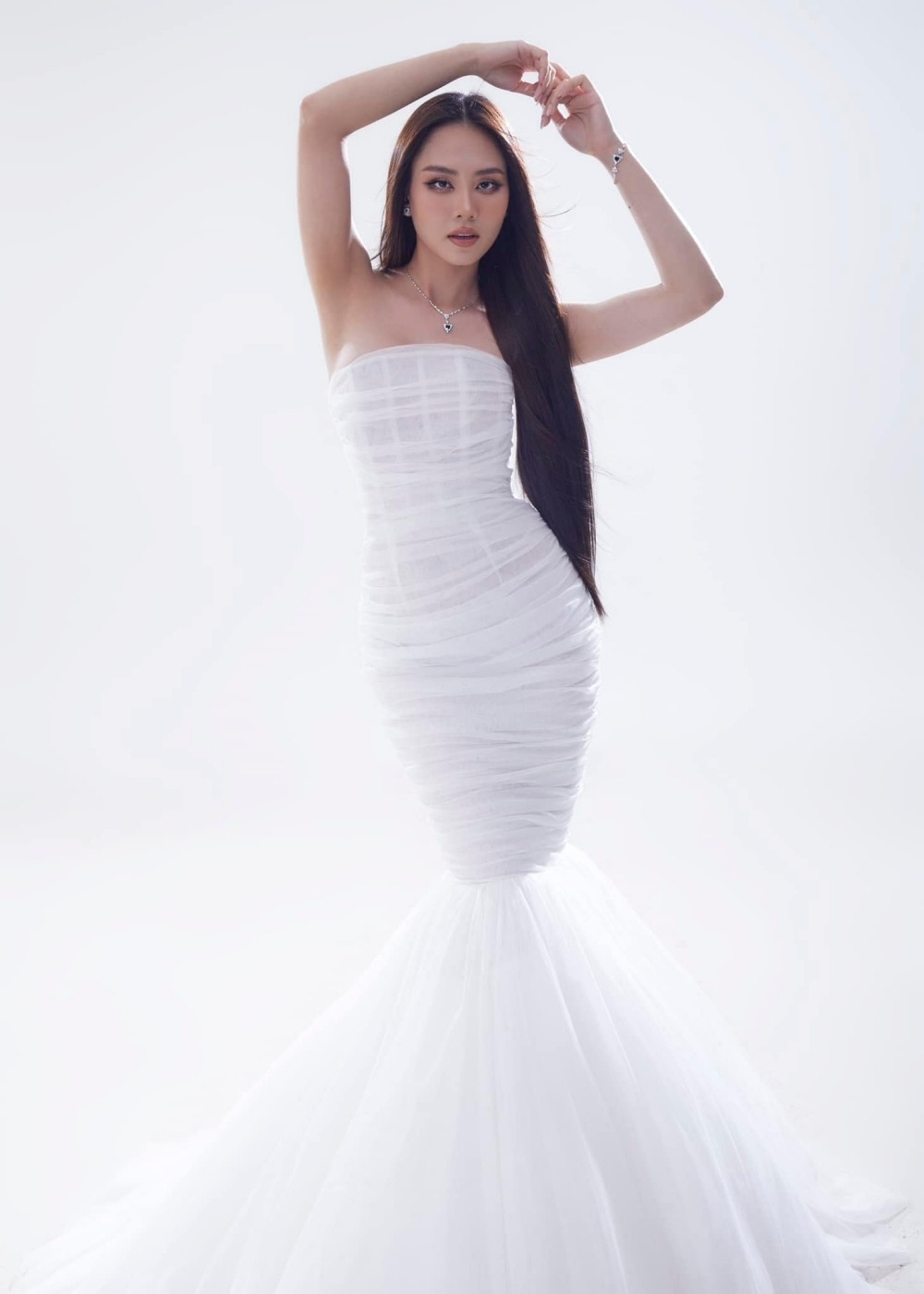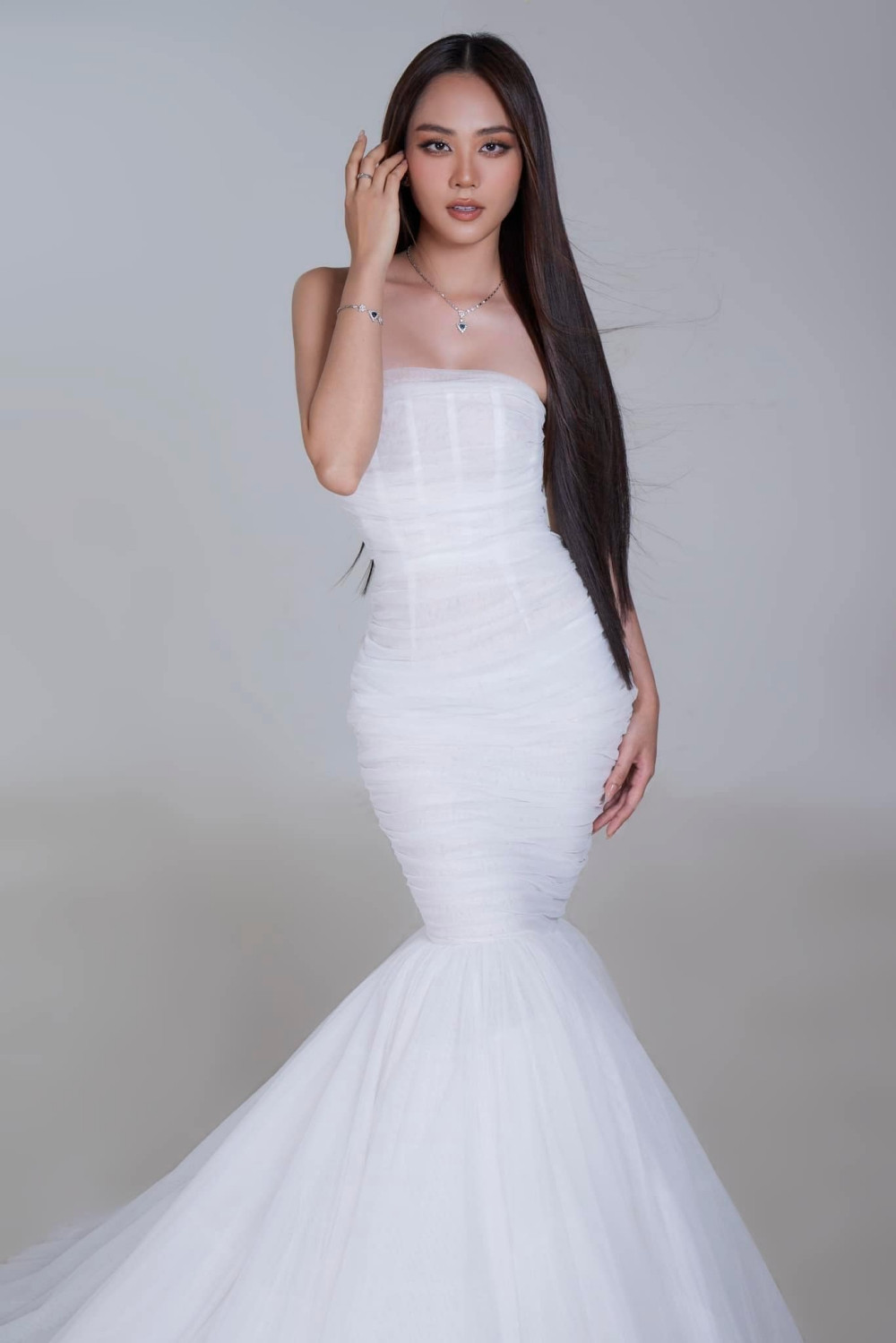 Mới đây, nàng hậu đã tung bộ ảnh mới trong thiết kế váy đuôi cá màu trắng. Chiếc váy được nhận xét là rất hợp với nhan sắc nhẹ nhàng của Mai Phương.