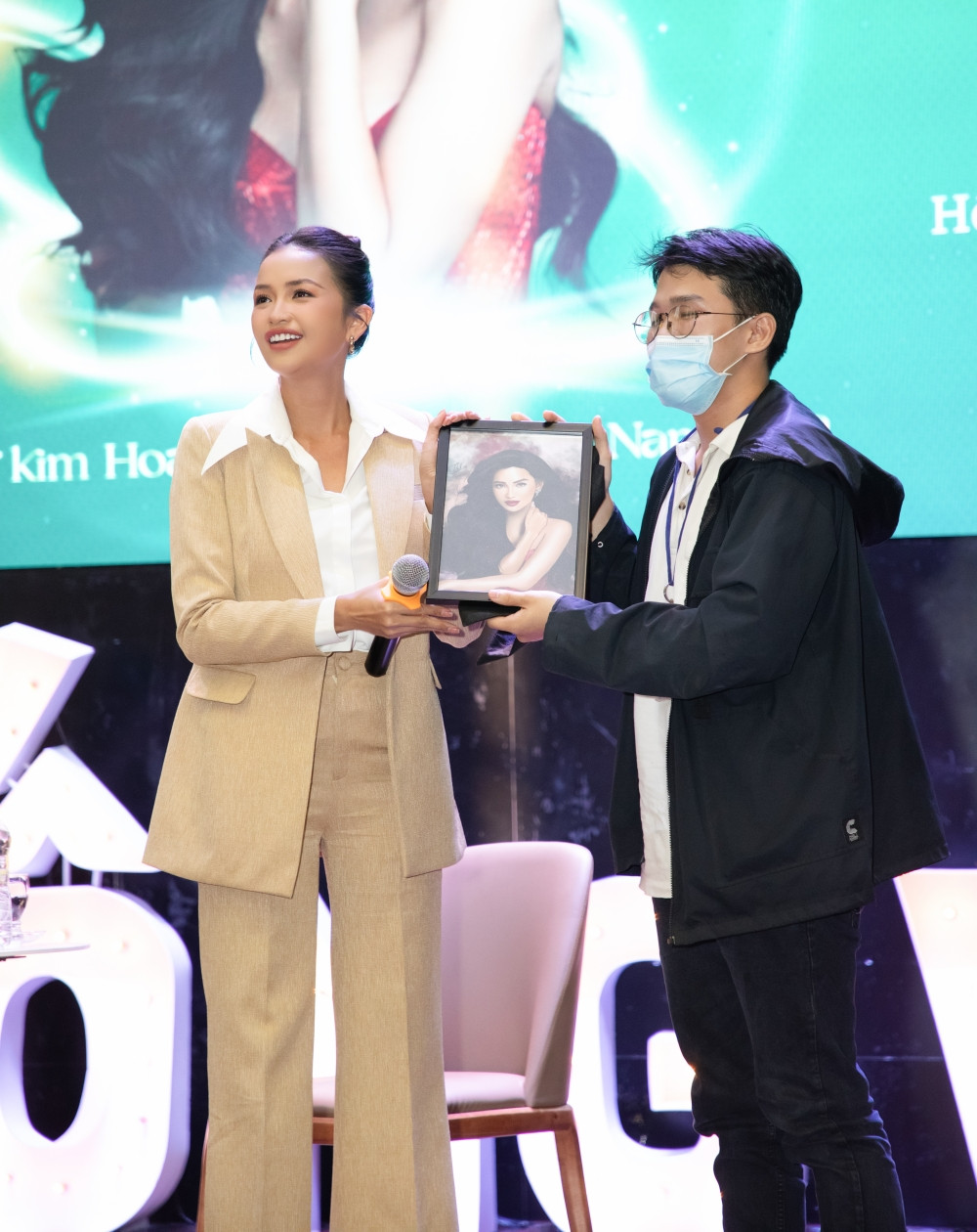 Người đẹp xuất hiện trong bộ trang phục suit màu nude đơn giản và kiểu tóc gọn gàng, thanh lịch. Đặc biệt, Hoa hậu Hoàn vũ Việt Nam 2022 còn nhận được một bức tranh vẽ chân dung cô từ một bạn sinh viên tặng.