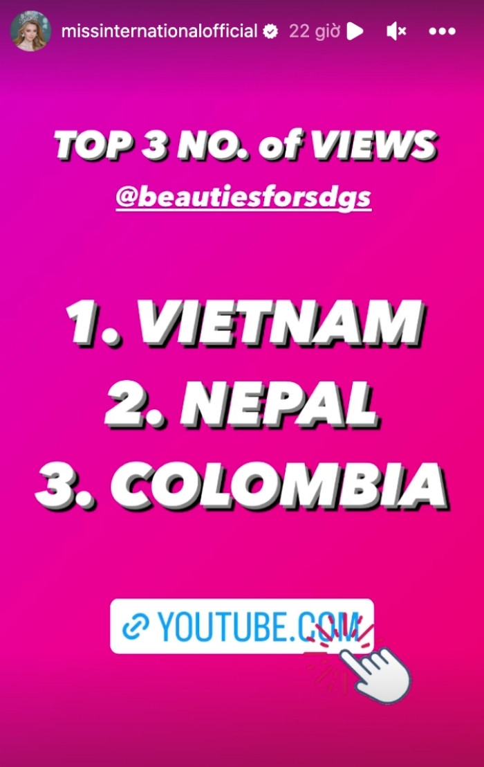Mới đây, trên story của trang chủ Miss International lại tiếp tục thông báo về các thí sinh có lượng view cao nhất ở video dự án nhân ái, được đăng trên kênh YouTube của cuộc thi, Á hậu Phương Nhi cũng giữ vững vị trí đầu bảng với hơn 16K view.