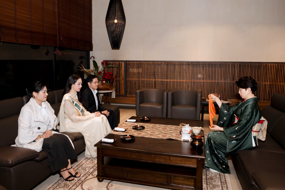 Hoa hậu Thanh Thủy và gia đình đã có cơ hội khám phá và tìm hiểu văn hóa Nhật Bản khi được Phu nhân Tổng Lãnh sự giới thiệu về nghệ thuật cắm hoa Ikebana và mời thưởng trà đạo do bà tự tay thực hiện.