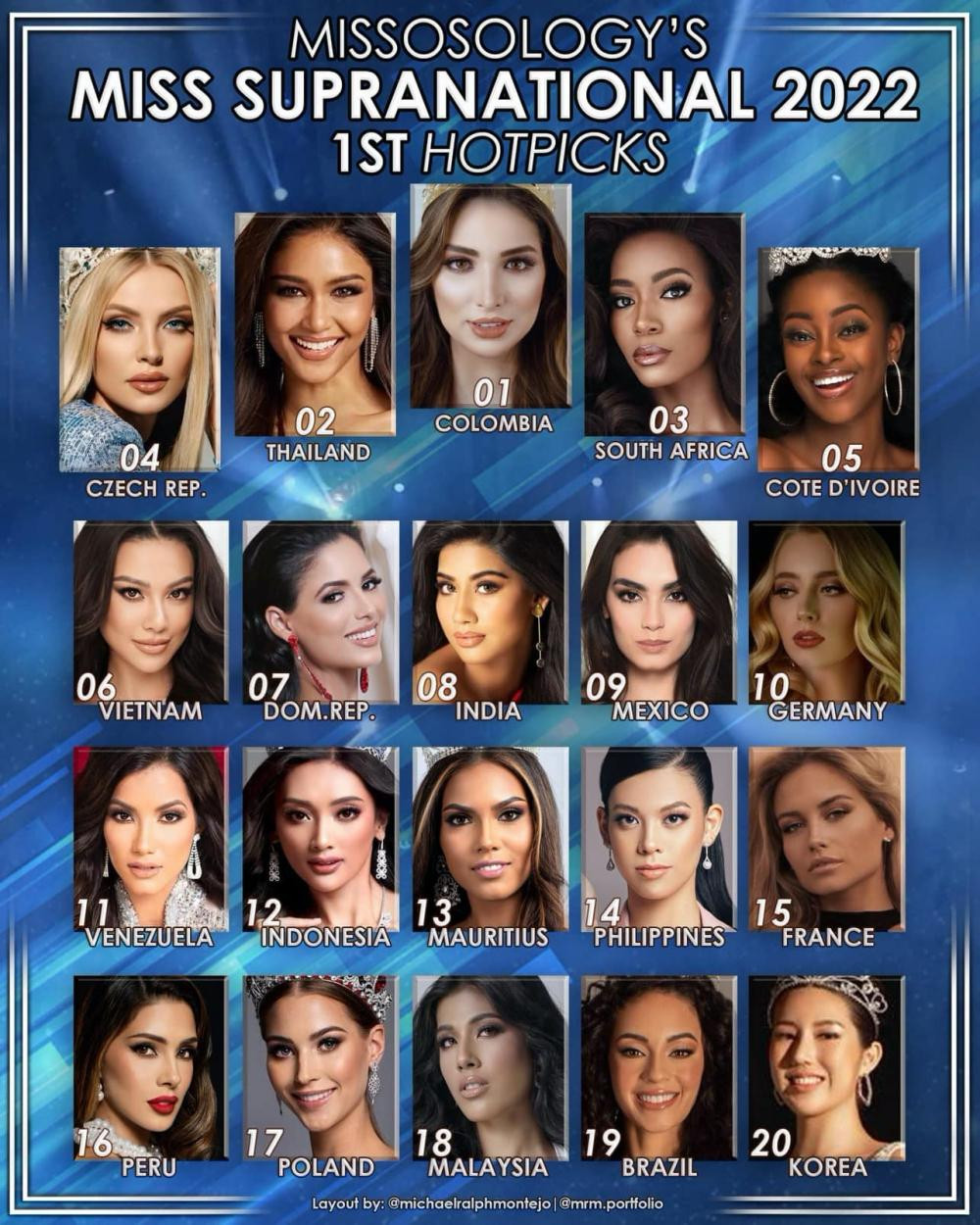 Hồi đầu tháng này, chuyên trang Sash Factor cũng đã đưa ra bảng dự đoán đầu tiên của Miss Supranational 2022. Vị trí Hoa hậu trong BXH dự đoán này thuộc về Kim Duyên. Người đẹp Nam Phi từng vượt qua Kim Duyên giành Á hậu 2 tại Miss Universe 2021, được cả 2 chuyên trang dự đoán sẽ lại giành Á hậu 2.