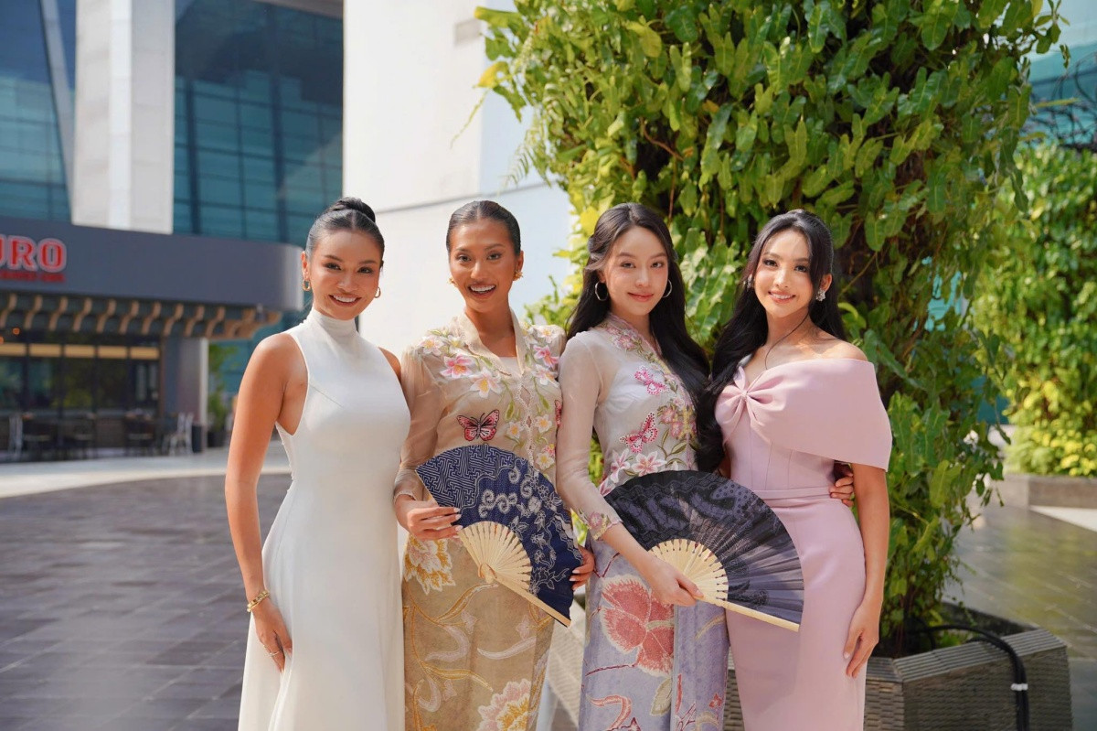 Thanh Thủy chung khung hình cùng Miss International Indonesia 2024 Sophie Kirana (ngoài cùng bên phải), Miss Cosmo 2024 Ketut Permata Juliastrid (thứ hai từ trái sang) và Á hậu Miss Cosmo 2024 người Thái Lan Karnruethai Tassabut.