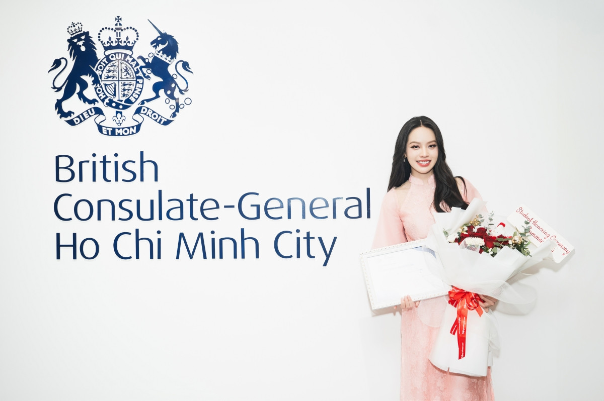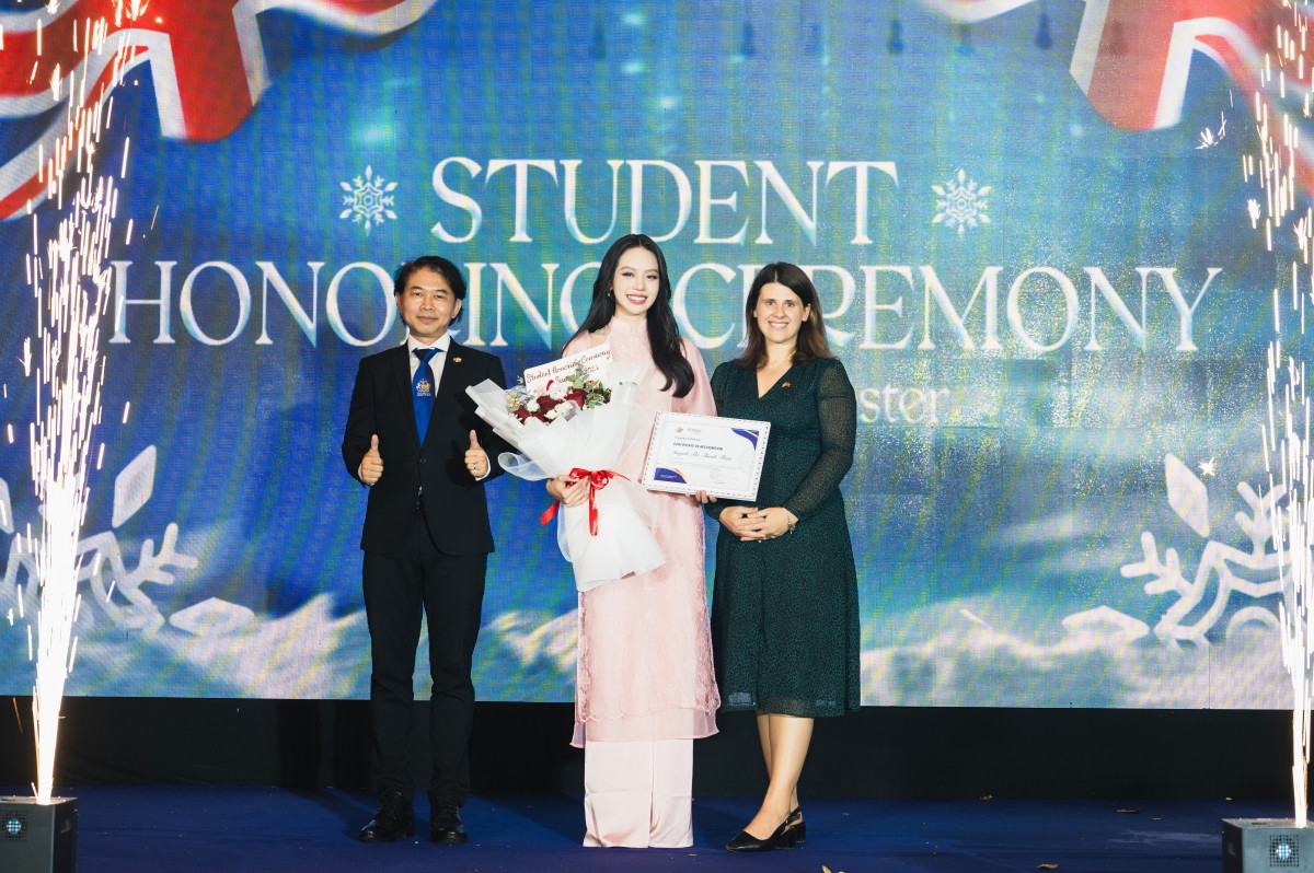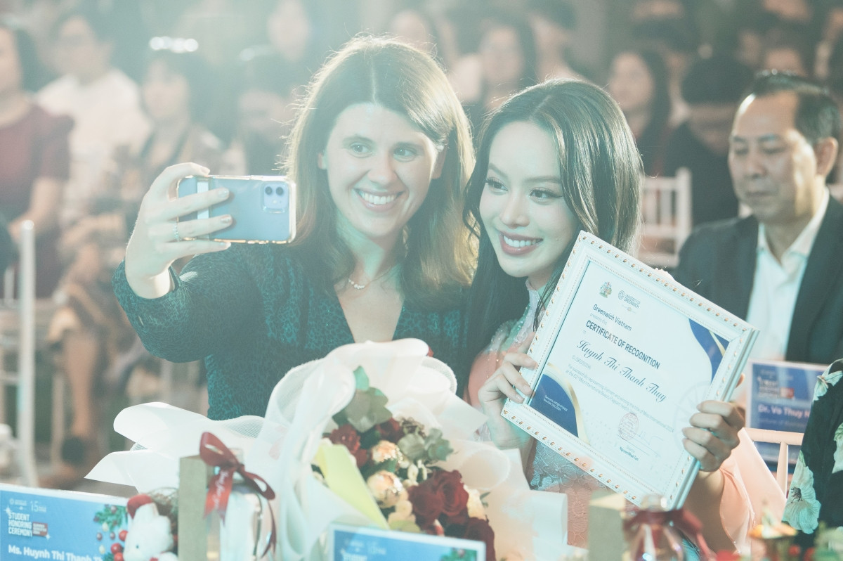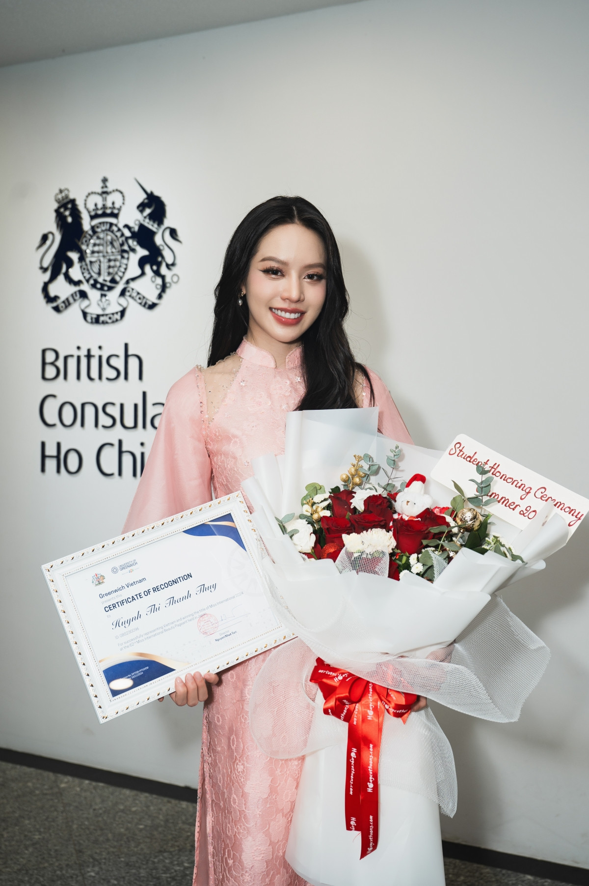 Hoa hậu Huỳnh Thị Thanh Thủy được đích thân Tổng lãnh sự Anh - bà Alexandra Smith và Giám đốc Greenwich Việt Nam - thầy Nguyễn Nhựt Tân trao giấy khen tại Lễ tôn vinh sinh viên của Greenwich Việt Nam.