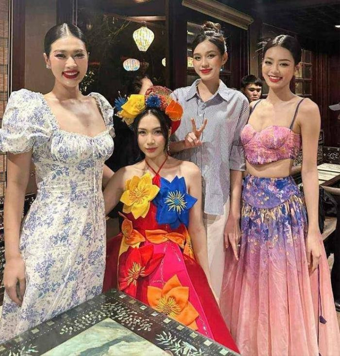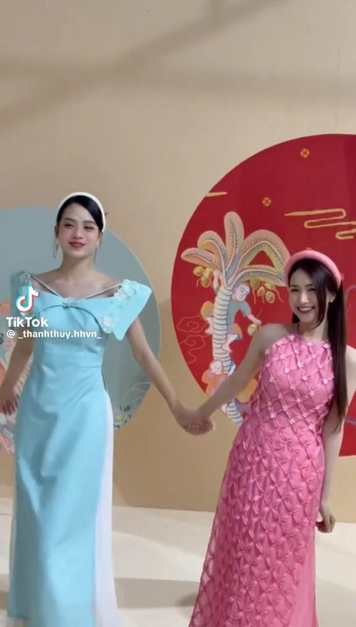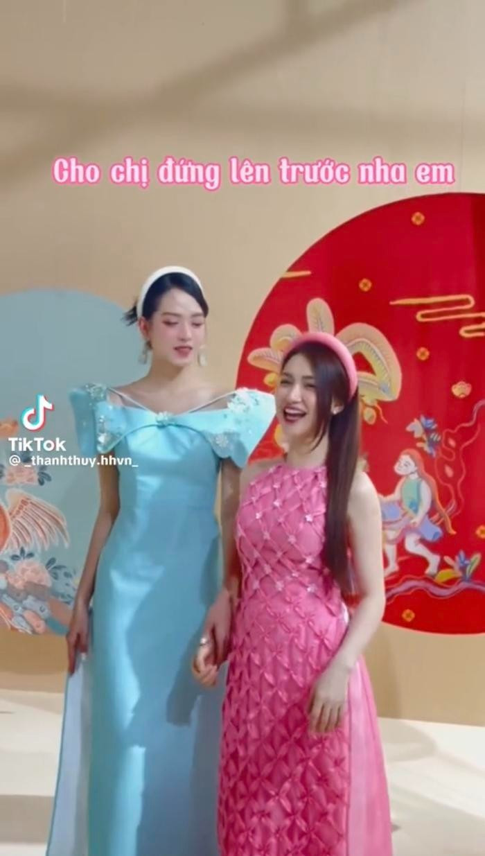 Hai người đẹp mặc áo dài có tông màu pastel đầy ngọt ngào. Vì Hòa Minzy thấp hơn Thanh Thủy tới 20 cm nên đã phải leo lên đôi giày siêu cao gót để bớt chênh lệch khi đứng cạnh Hoa hậu Việt Nam 2020.