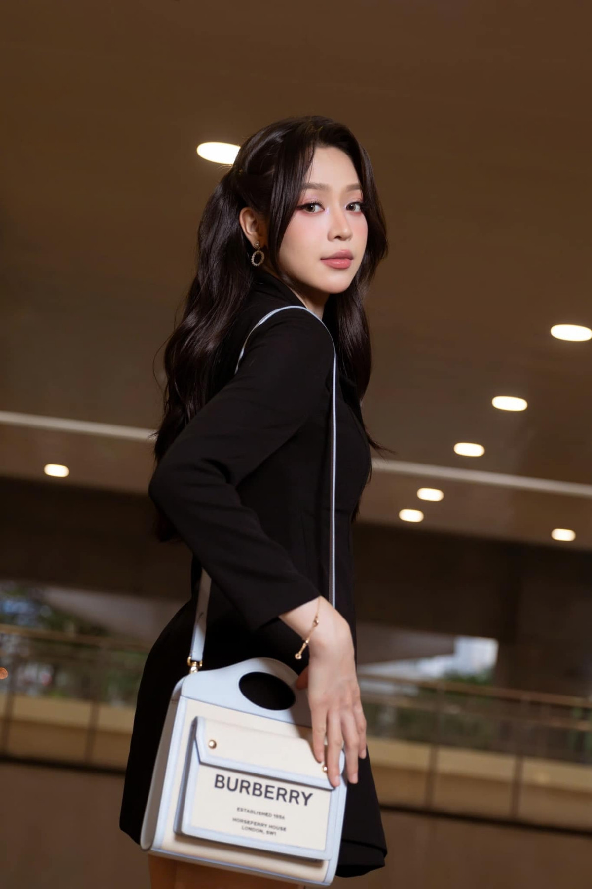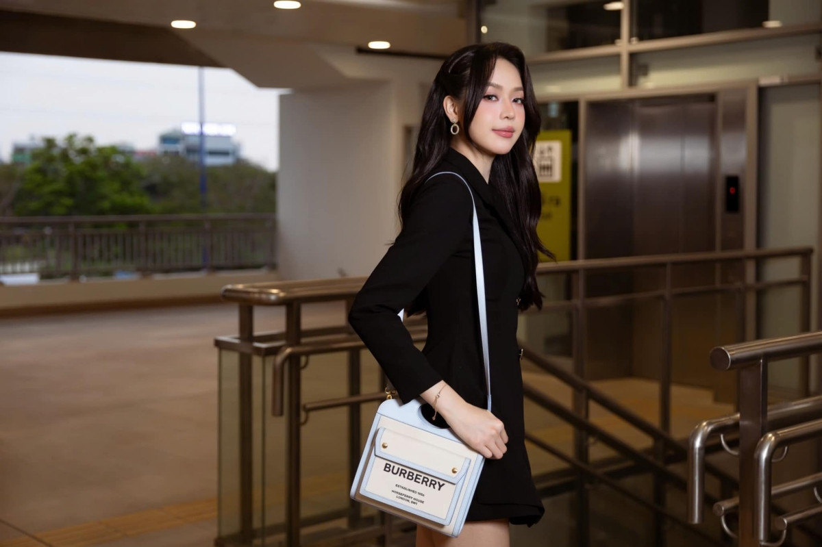 Mẫu túi tote khá quen thuộc của Burberry có giá khoảng 30 triệu đồng. Hoa hậu Thanh Thủy không chọn màu nâu quen thuộc của thương hiệu, cô chọn chiếc túi phiên bản có màu sáng, nổi bật, mang đến sự trẻ trung.