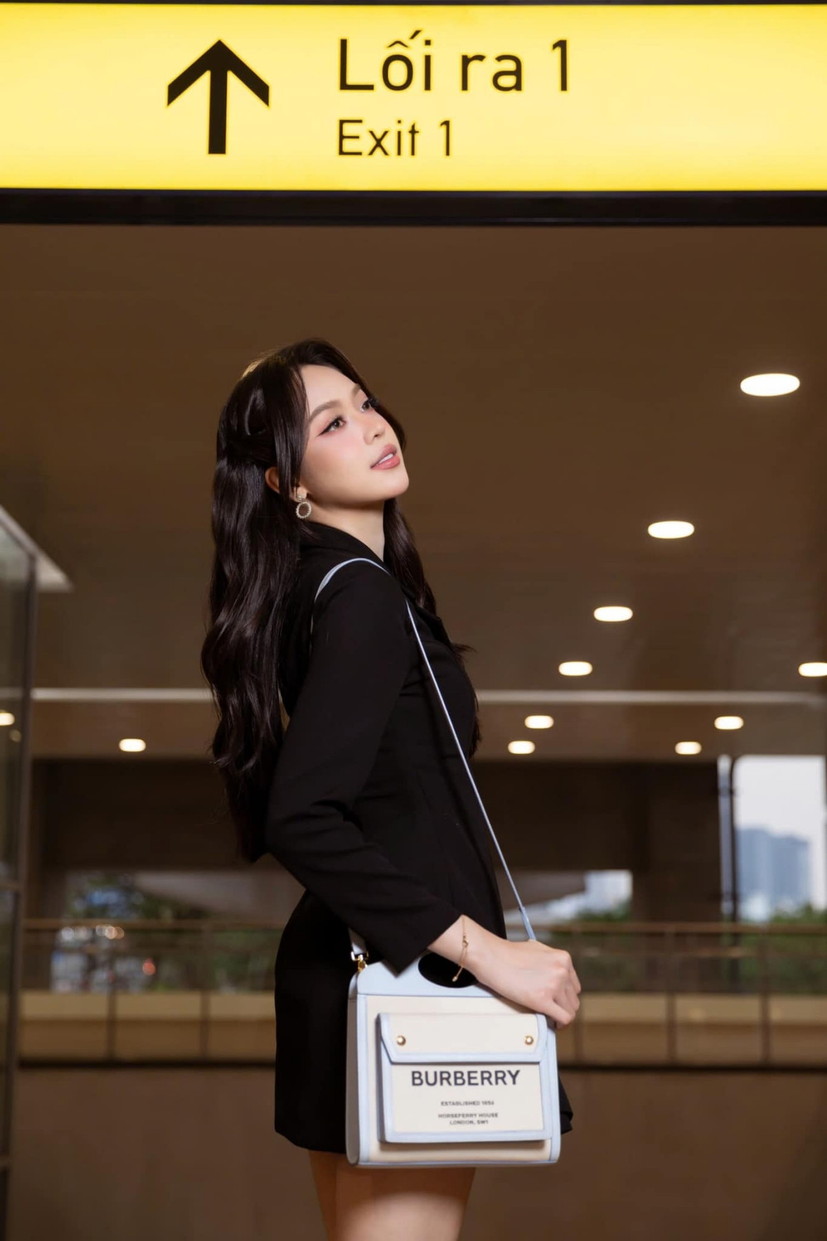 Khoe trên trang cá nhân loạt ảnh chụp tại nhà ga metro TP.HCM, Hoa hậu Thanh Thủy mặc trang phục màu đen đơn giản, trang điểm nhẹ nhàng. Nàng hậu chọn mẫu túi đeo chéo của thương hiệu Burberry làm điểm nhấn.