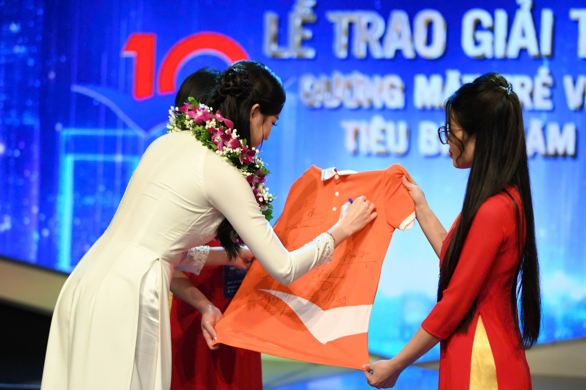Hoa hậu Thanh Thủy ký tên lên áo lưu niệm Quỹ Hỗ trợ Tài năng trẻ Việt Nam.