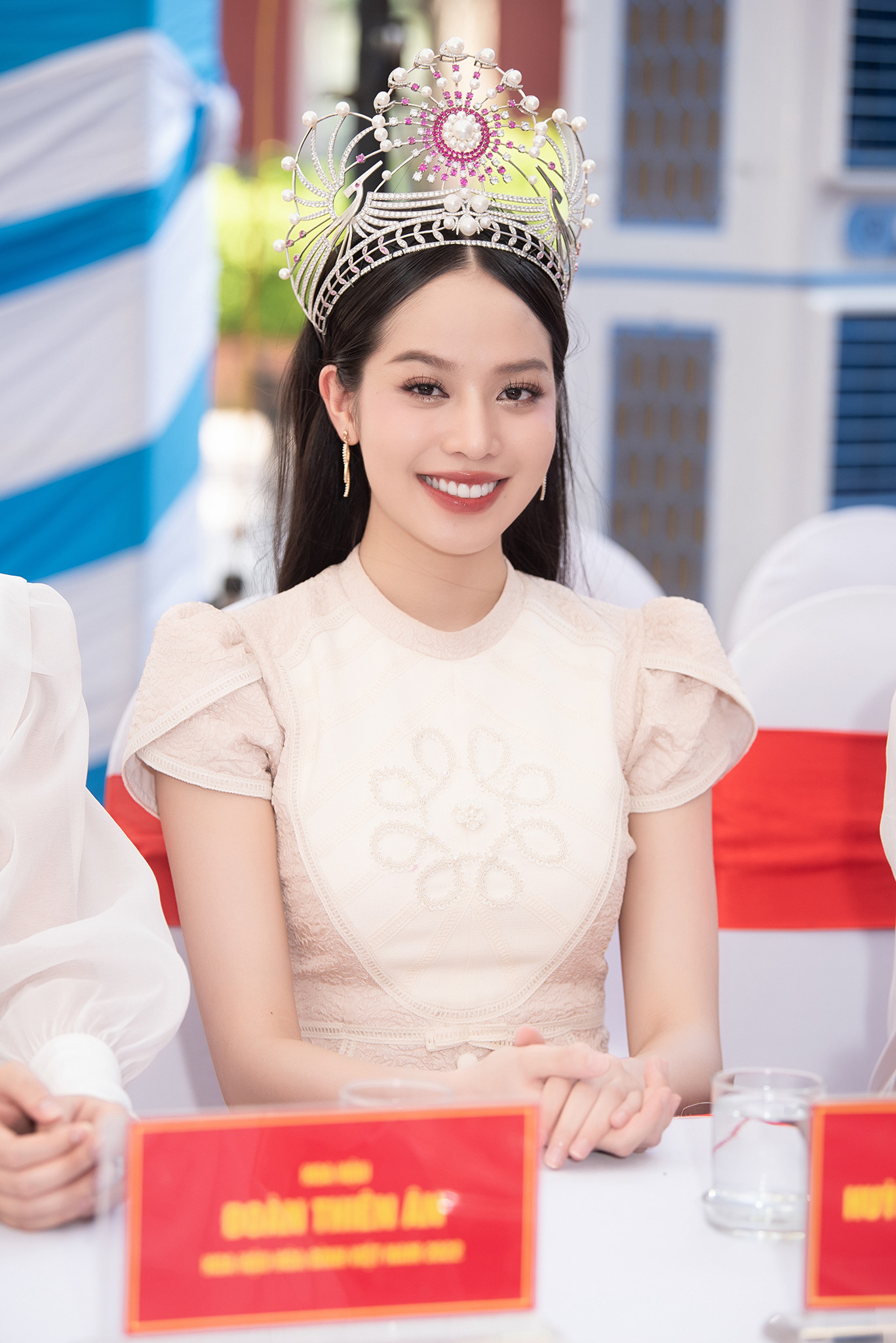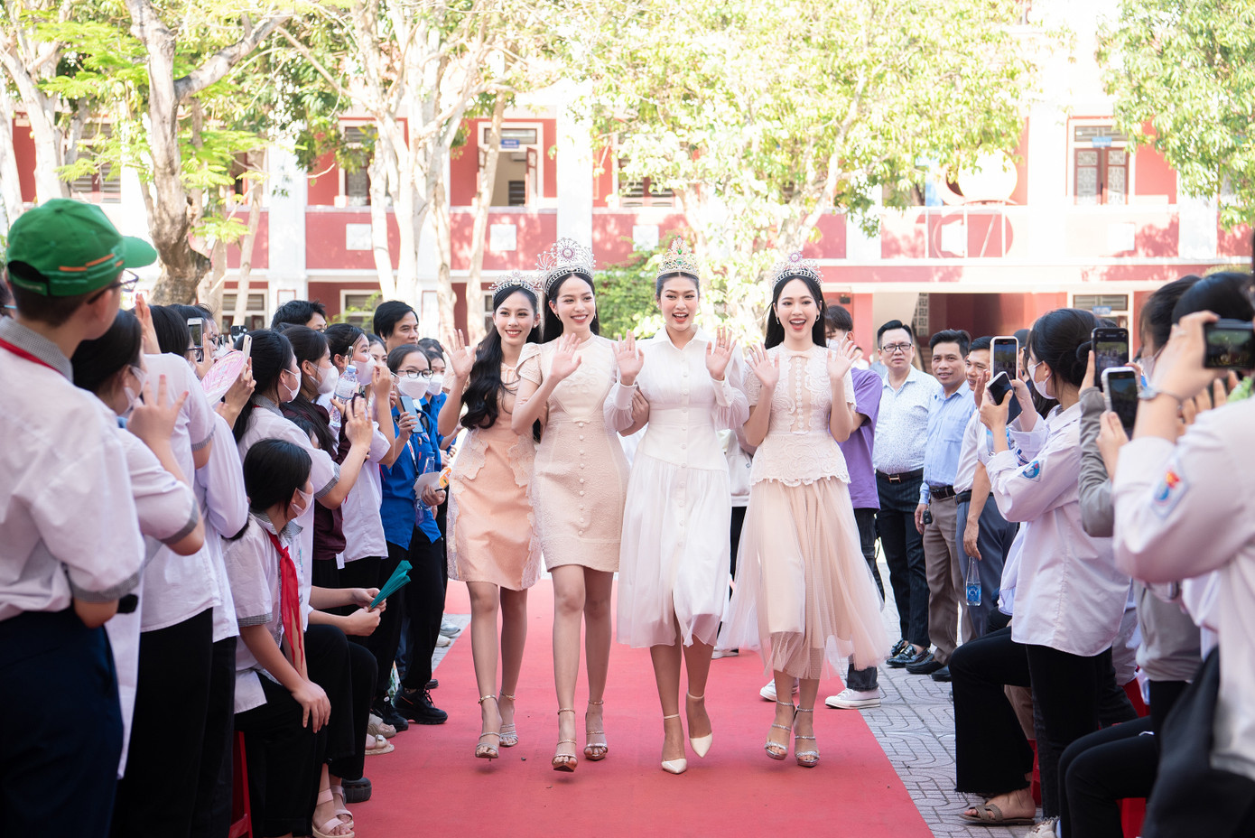 Top 3 Hoa hậu Việt Nam 2022 Huỳnh Thị Thanh Thủy, Trịnh Thùy Linh, Lê Nguyễn Ngọc Hằng cùng Miss Grand Vietnam 2022 Đoàn Thiên Ân xuất hiện với thần thái rạng rỡ khi tham dự chương trình tại THPT Huỳnh Thúc Kháng (TP. Vinh, Nghệ An). Các ‘nàng Hậu’ xinh đẹp, thân thiện được chào đón giữa hàng ngàn học sinh.
