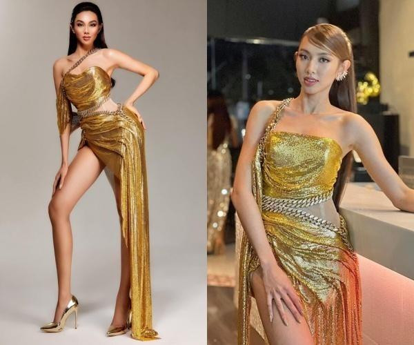Khi Thùy Tiên thử đồ để chuẩn bị mang sang cuộc thi Miss Grand International 2021, rõ ràng mẫu váy này có dây chéo vai. Nhưng đến lúc diện chính bộ váy ấy trong một hoạt động thì nàng hậu lại quên vắt dây qua cổ.