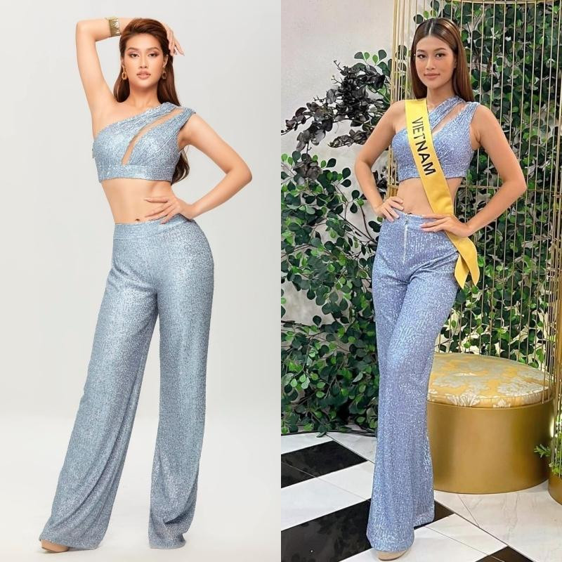 Có lẽ vì thời gian chuẩn bị đi thi quốc tế quá ngắn, chưa kịp nhớ hết những bộ đồ mang theo nên Thiên Ân vừa gặp phải một sự cố hài hước. Mới đây, Thiên Ân diện một set đồ ánh kim vô cùng thời thượng gồm quần cạp cao ống rộng, áo crop-top cắt xẻ khoe vòng eo thon.