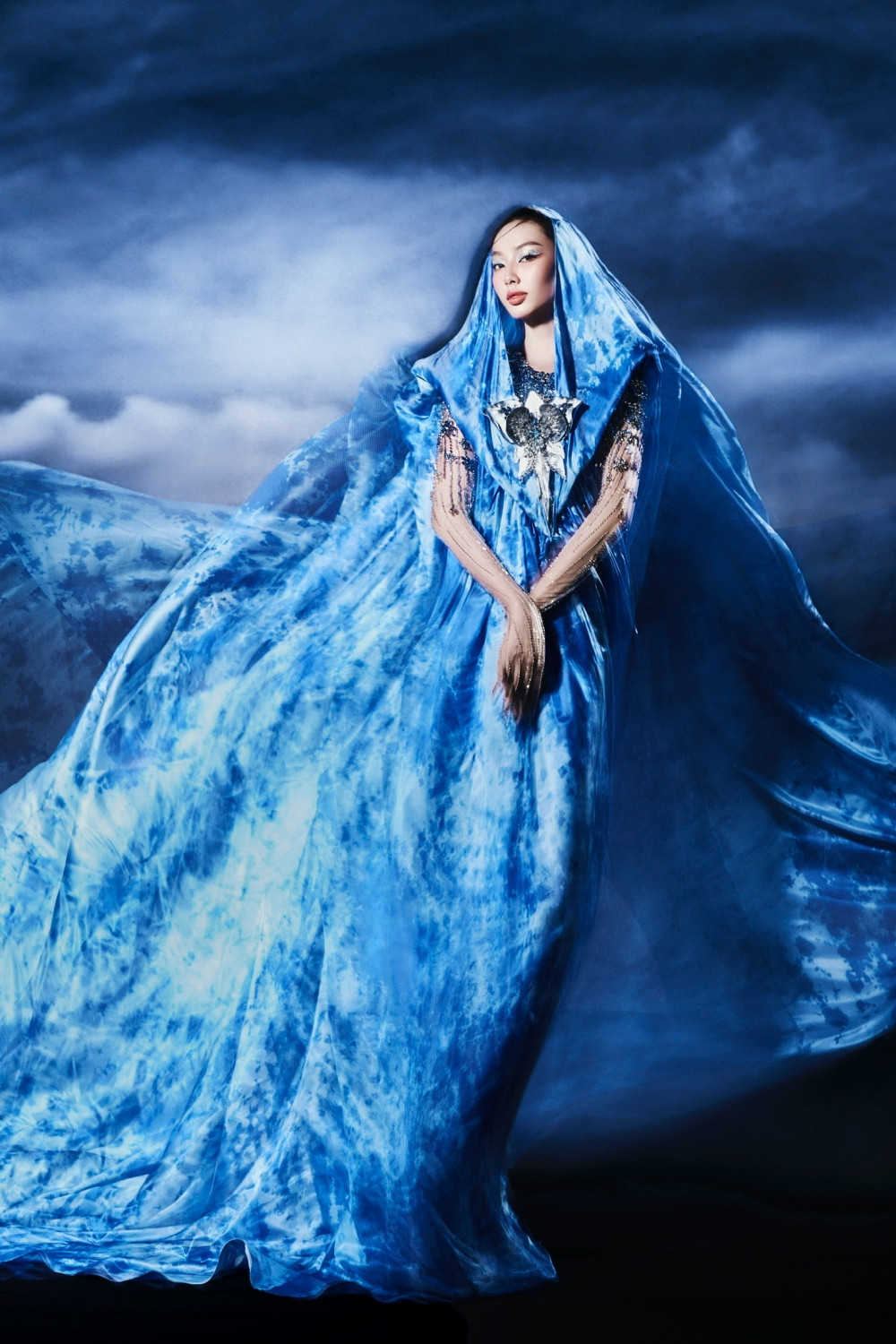 Nàng hậu chứng tỏ sự chuyên nghiệp khi nắm bắt nhanh ý đồ của ê-kíp. Với mái tóc bạch kim cùng lối trang điểm sắc sảo, có thể thấy cô đã hoàn toàn thoát khỏi hình ảnh của một hoa hậu để trở thành một người mẫu high fashion.