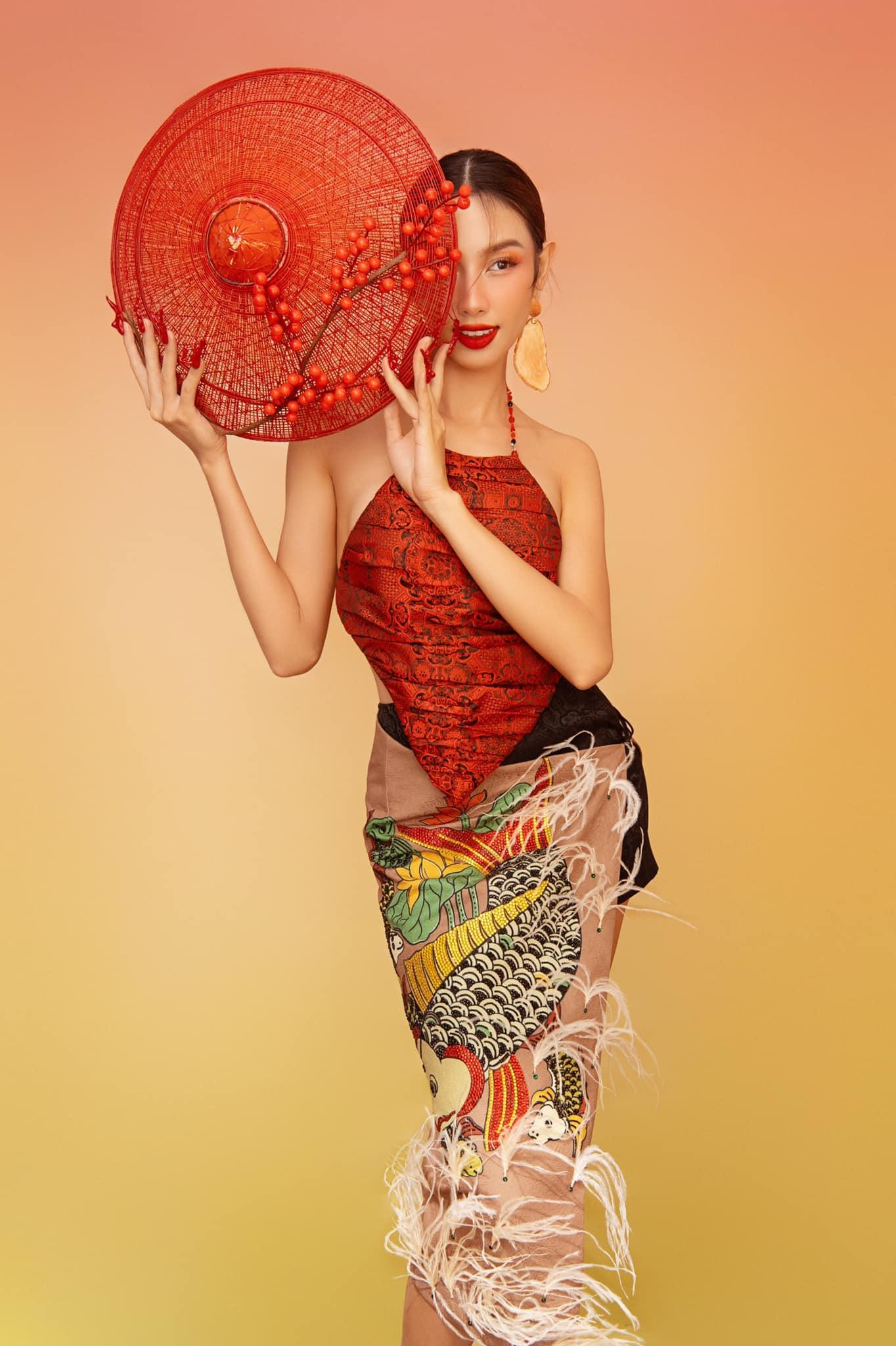 | Các thiết kế đều được phối hợp với những phụ kiện truyền thống như nón lá, nhánh đông đào, tò he hay chiếc quạt cầm tay. Có thể nói đây là bộ hình mãn nhãn cả về thời trang lẫn nghệ thuật. |