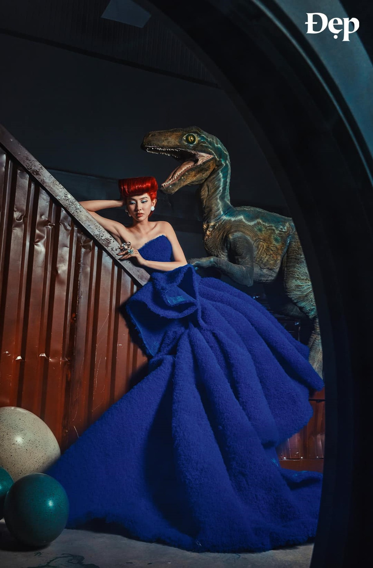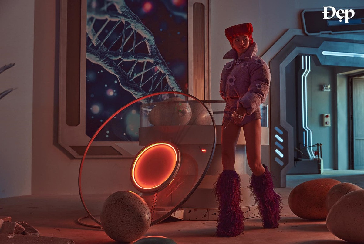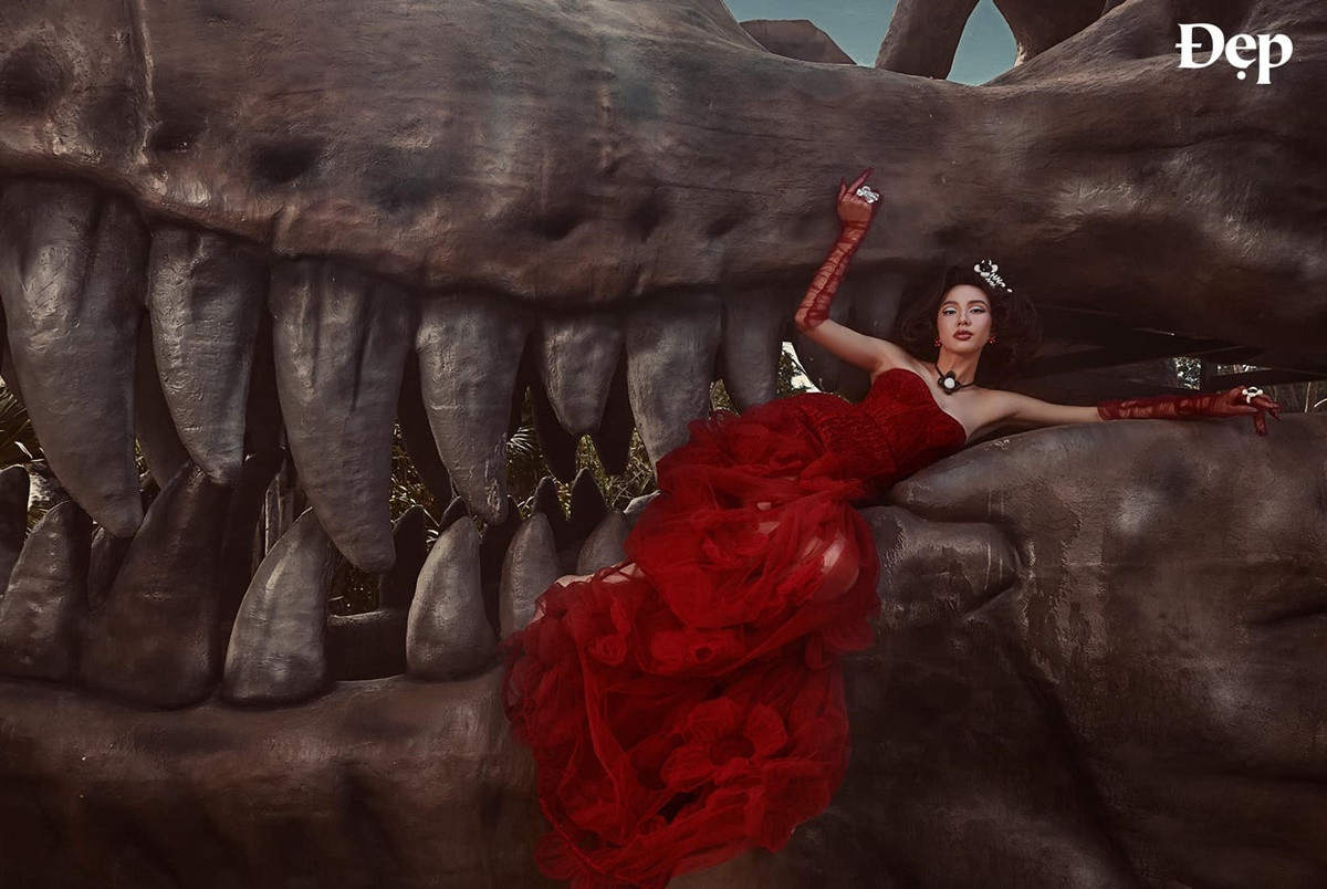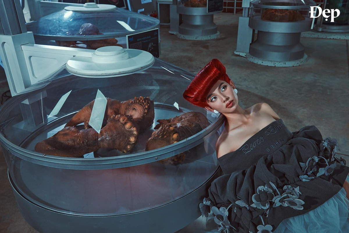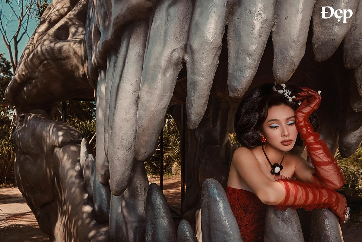 Hoa hậu Thùy Tiên được mời làm gương mặt trang bìa cho tạp chí Đẹp đầu năm, người đẹp mặc trang phục và làm tóc mang đậm tinh thần vị lai (Futurism), nhưng lại thực hiện bộ ảnh tại công viên khủng long, loài vật của quá khứ.