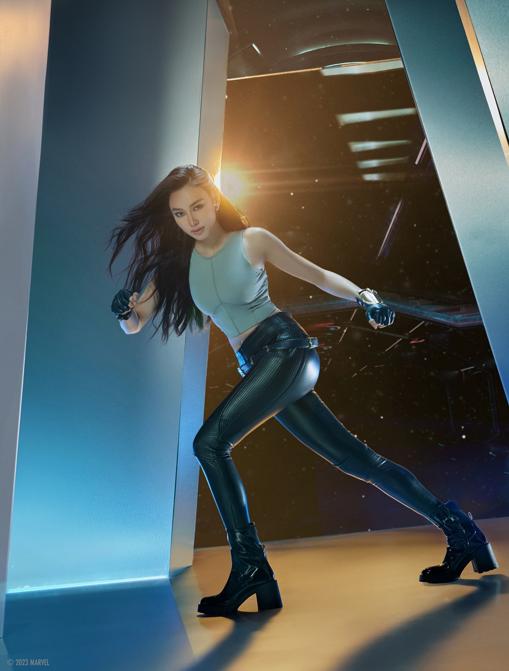 Đó là bộ ảnh Hoa hậu Thùy Tiên hóa thân thành Captain Marvel với bộ trang phục chiến đấu quen thuộc, được kết hợp từ 2 màu đỏ - xanh và huy hiệu ngôi sao ngay giữa ngực. Nếu để ý kĩ thì trang phục trong phần phim mới của Captain Marvel có điểm khác với phần 1. Tay áo dài được cắt ngắn, giúp hình tượng của nàng siêu anh hùng trở nên trẻ trung, năng động hơn.