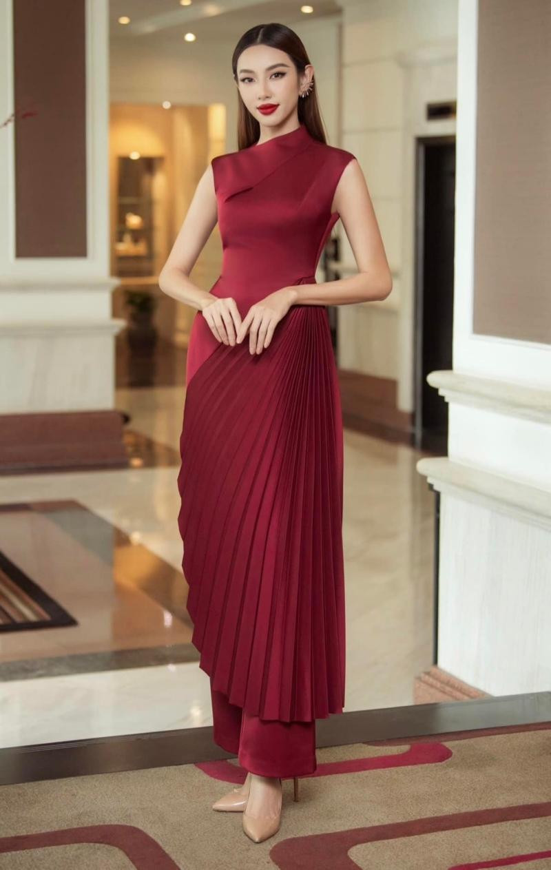 Mẫu áo dài màu đỏ thoáng nhìn sẽ tưởng đây là một chiếc váy liền, nhưng thực ra lại là một mẫu áo dài cách tân rất đẹp mắt, với phần tà được xếp li độc đáo, của thương hiệu CHATS, một trong những thương hiệu rất được lòng các người đẹp showbiz Việt.