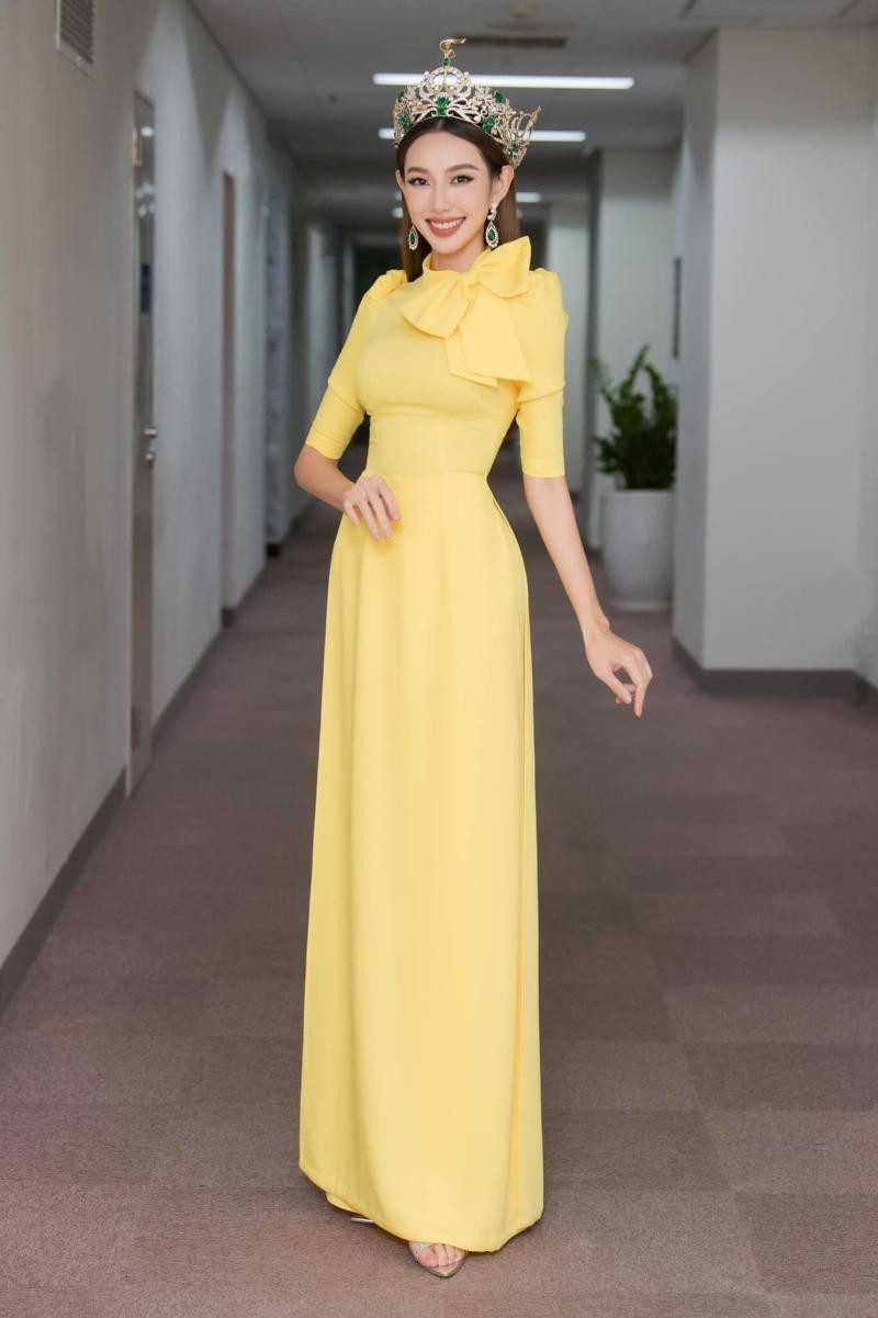 Mẫu áo dài màu vàng tiếp tục là một thiết kế đến từ NTK áo dài nổi tiếng Song Toàn. Thiết kế khoe trọn vòng eo siêu nhỏ của Hoa hậu Thùy Tiên, khiến không ít người hâm mộ trêu đùa: “Ăn nhiều bông lan trứng muối mà sao eo vẫn nhỏ như vậy chị ơi?”. Song Toàn là thương hiệu áo dài đã gắn bó với Hoa hậu Thùy Tiên một thời gian dài.