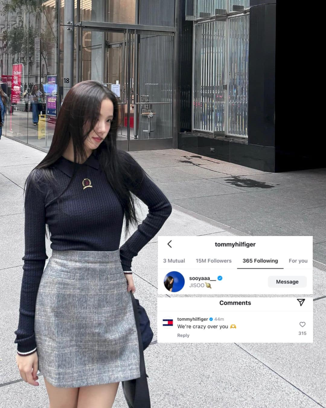 Hình ảnh Jisoo trên đường phố New York, tài khoản chính thức của thương hiệu thể hiện sự yêu mến với Jisoo qua câu bình luận: We're crazy over you! (tạm dịch: Chúng tôi phát cuồng vì bạn!)