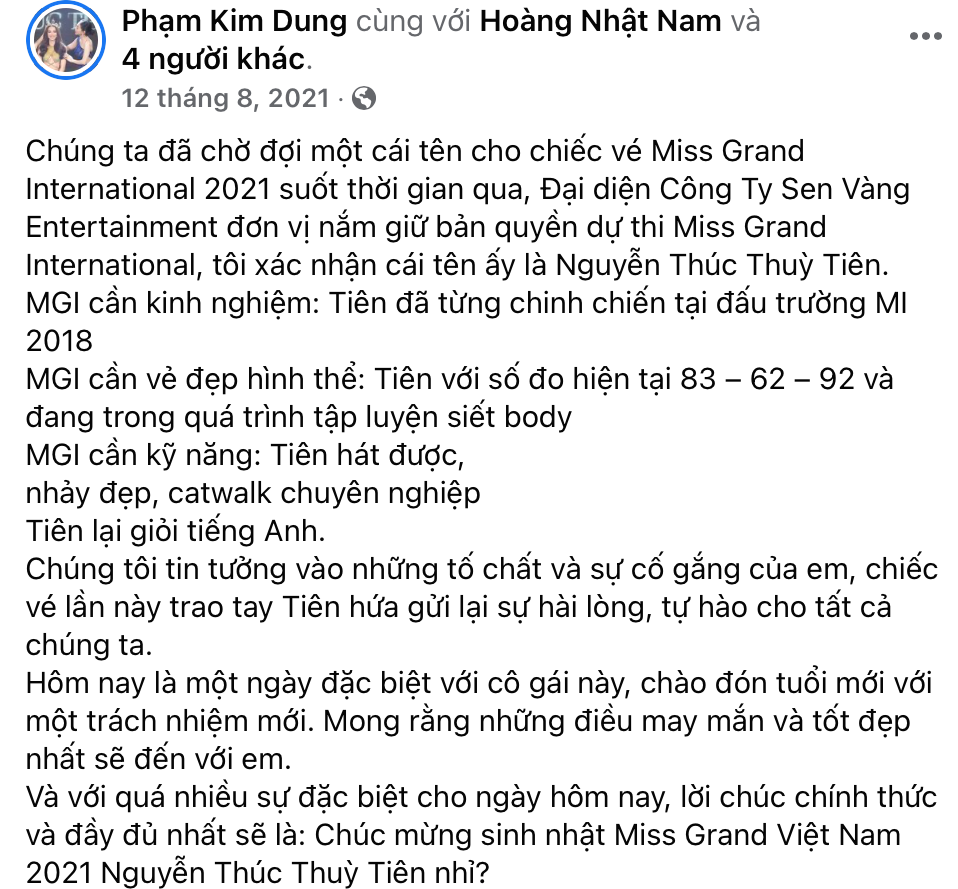 Mới đây, bà Kim Dung đã tìm lại bài viết cũ từ nhiều tháng trước, và tag Hoa hậu Thùy Tiên để hỏi cô còn nhớ bài đăng này không. Và Thùy Tiên đã kể rằng khi mới công bố tên người được chọn, cô đã không dám đăng nhập vào Facebook hai ngày để tránh phải đọc các bình luận tiêu cực. Có lẽ khi ấy, Thùy Tiên cũng đoán rằng sẽ có không ít người phản đối mình nên không muốn đọc được những lời chê bai, chỉ trích khiến cô nhụt chí.